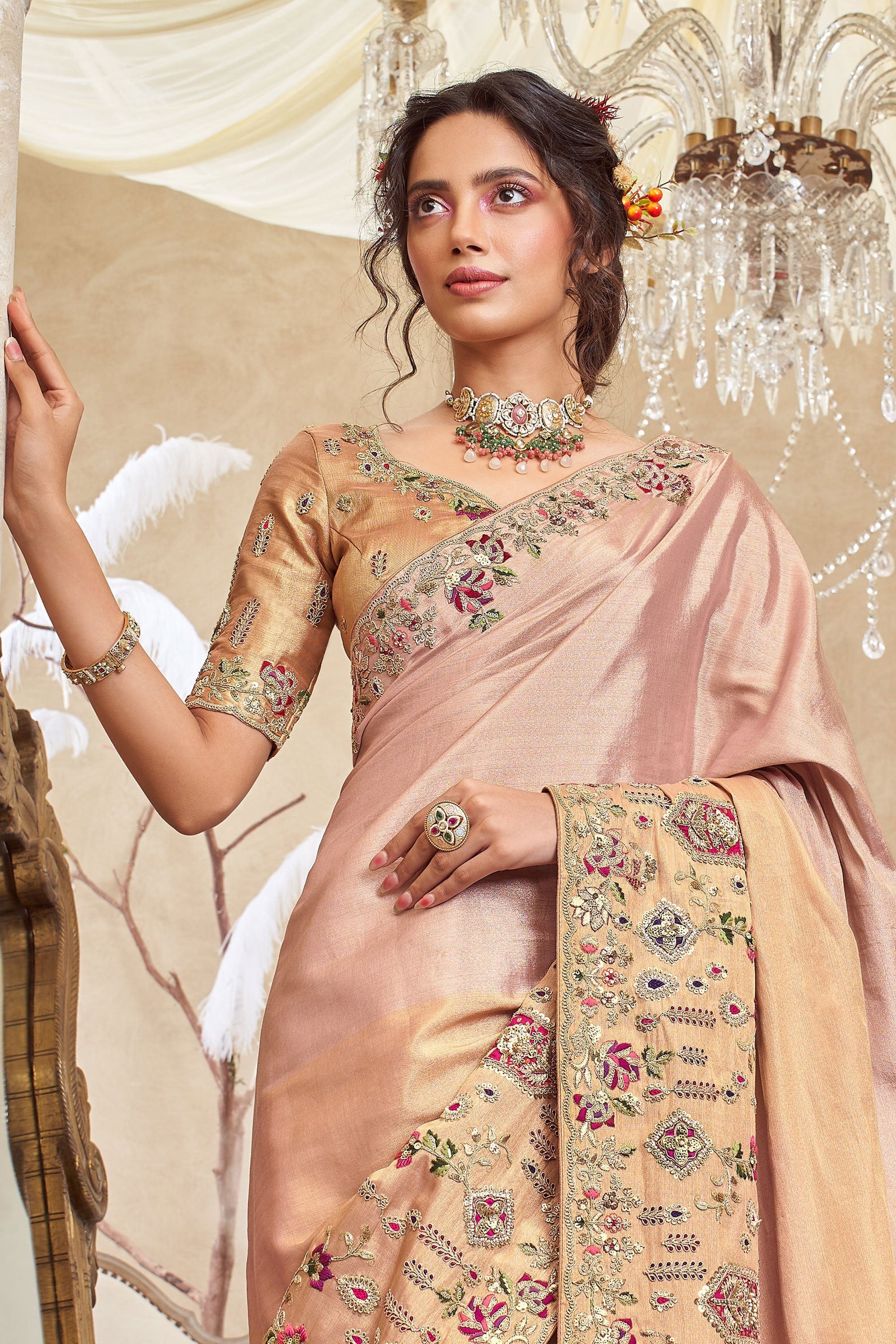 Peach Wedding Wear Embroidered Viscose Silk Fabric Saree