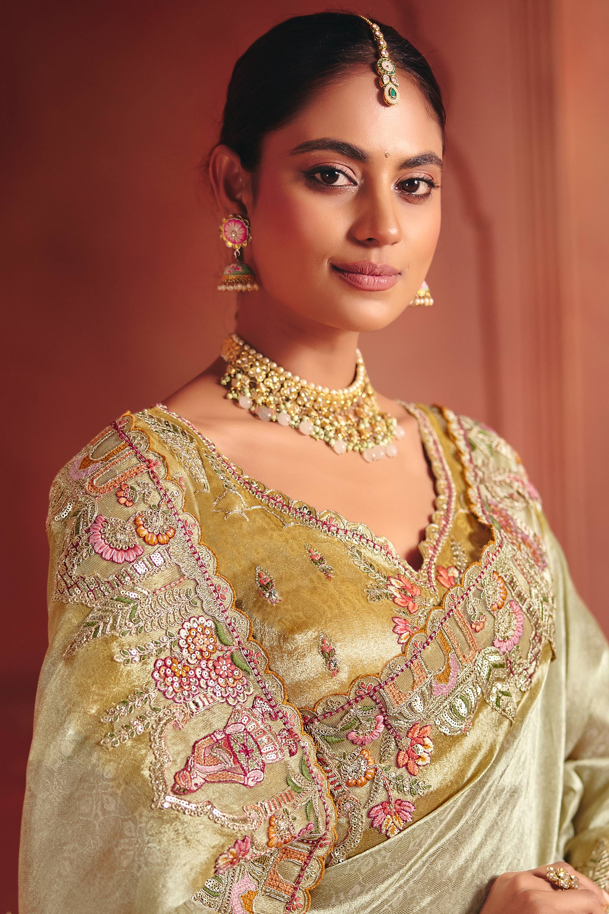 Peach Wedding Wear Silk Fabric Embroidered Saree