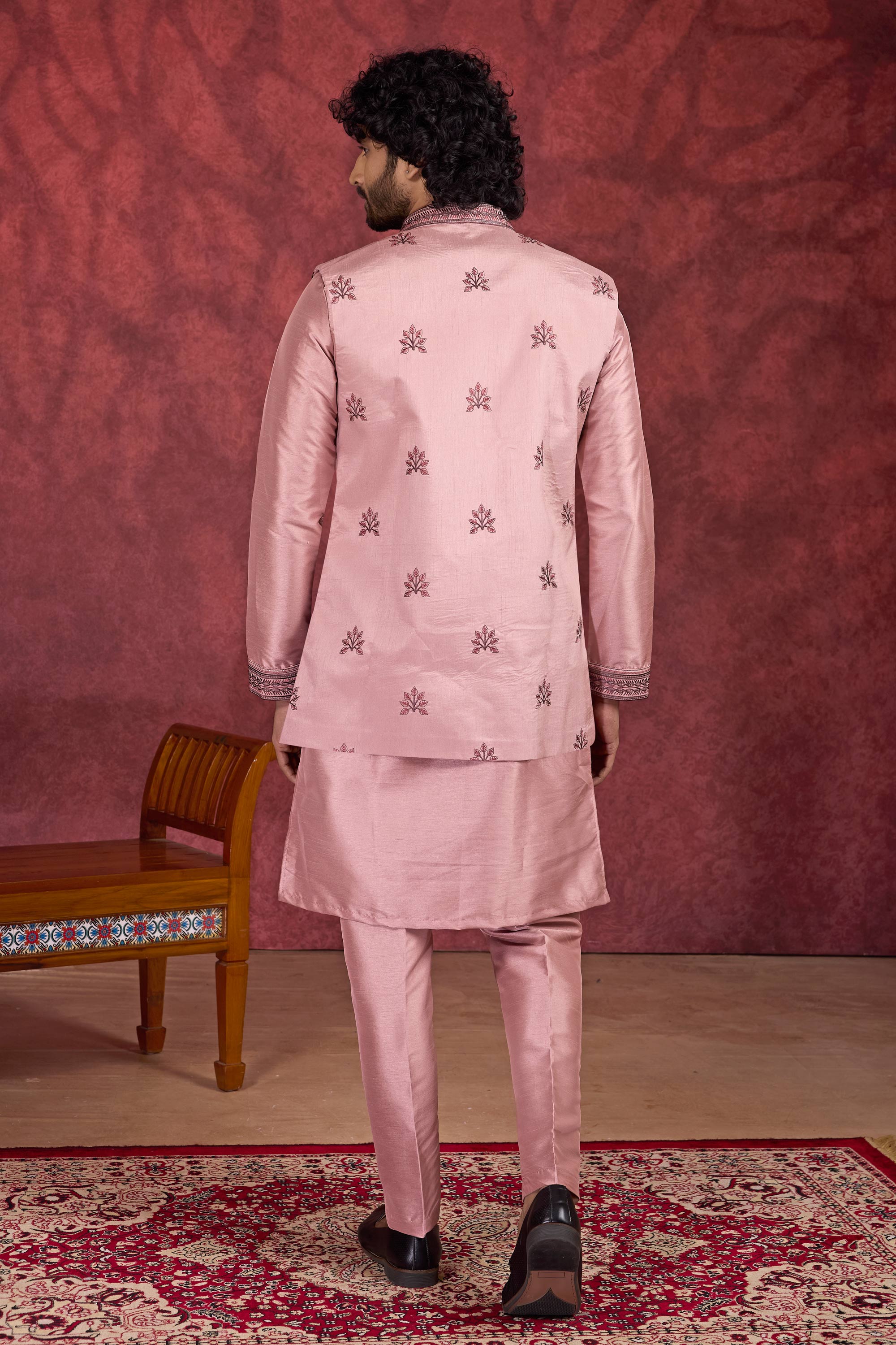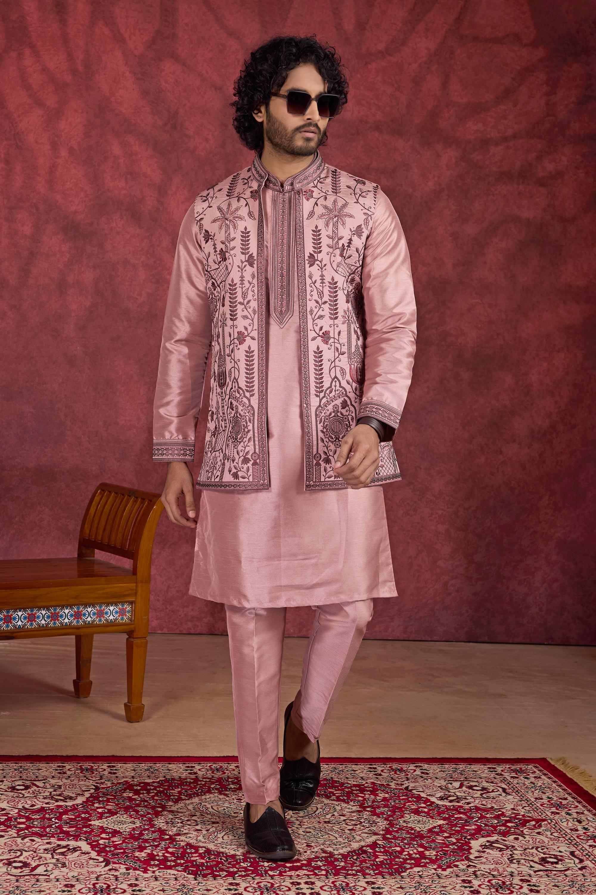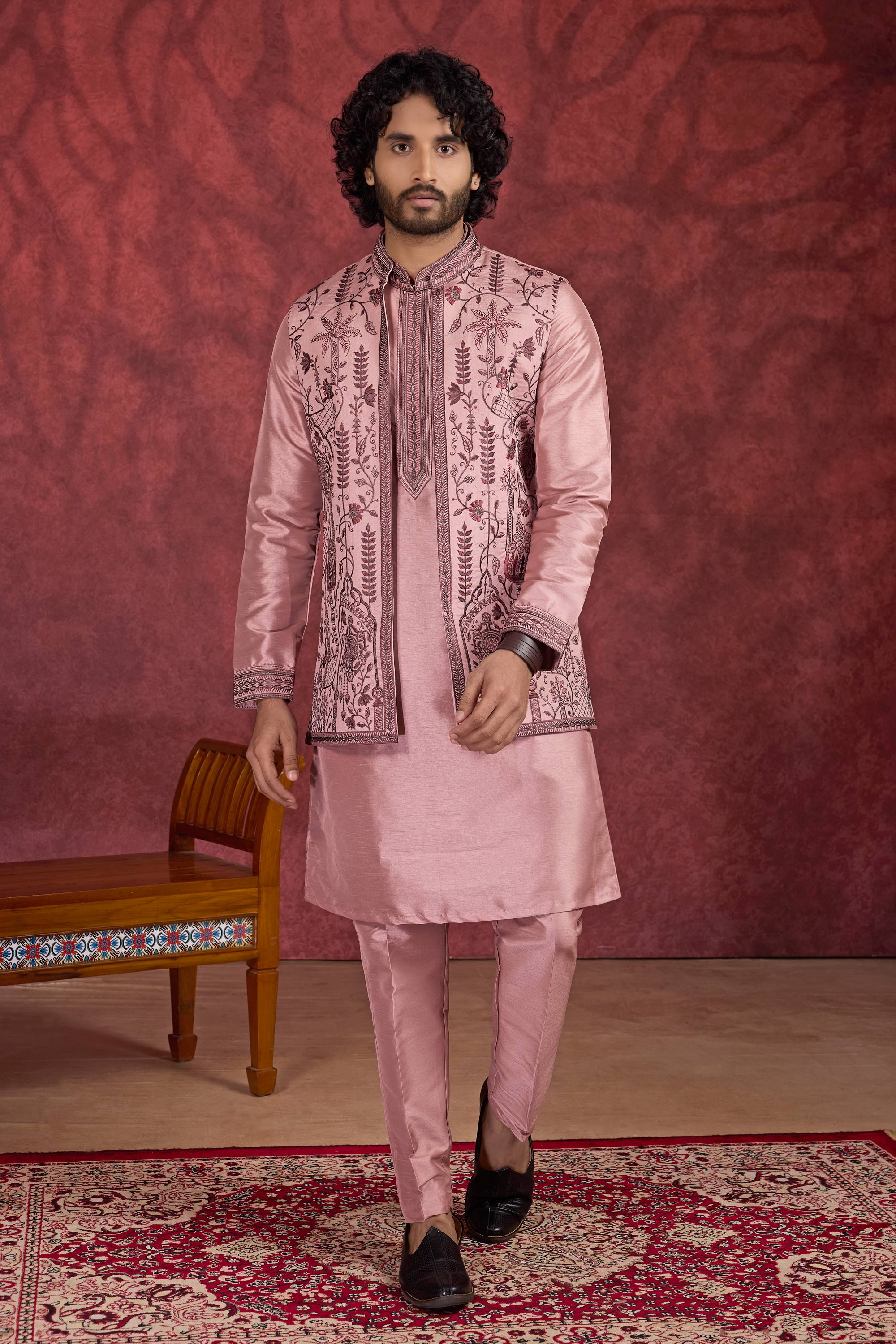 Pink Art Silk Readymade Men Kurta Pyjama With jacket