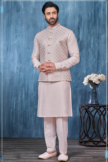 Pink Banarasi Silk Fabric Festive Wear Embroidery Work Readymade Kurta Pyjama For Men With Jacket
