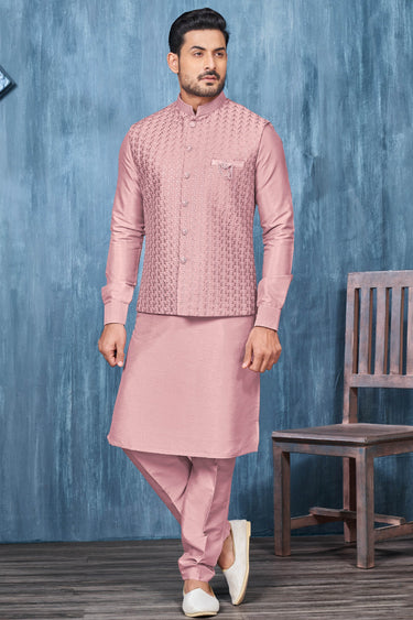 Pink Color Banarasi Silk Fabric Readymade Embroidery Work Men Kurta Pyjama With Jacket