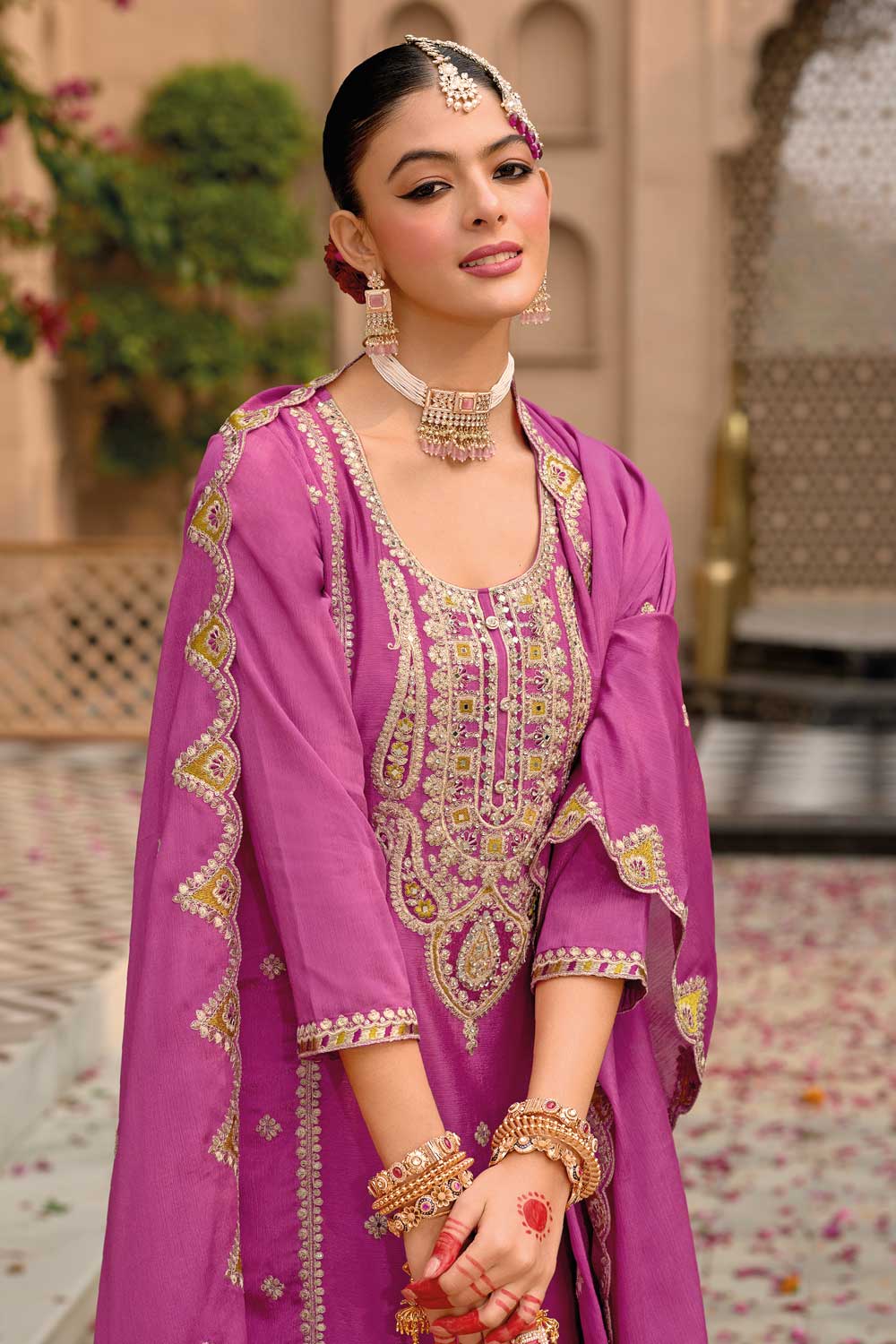 Elevate your ethnic style with this Readymade Palazzo Suit, a masterpiece crafted from Heavy Chinon fabric. The luxurious texture and intricate embroidery work make it a stunning choice for festive occasions, functions, and Eid celebrations. Top Details: Heavy Chinon with exquisite embroidery, 42-inch length for a graceful look. Bottom Details: Heavy Chinon Palazzo for unmatched comfort and elegance. Dupatta: Coordinating Heavy Chinon dupatta with delicate details, completing the ensemble with charm. This outfit effortlessly blends traditional craftsmanship with contemporary sophistication, ensuring you stand out in every celebration. Please note: Slight color variations may occur due to digital photography. Turn heads with this timeless creation, designed to make every occasion memorable!