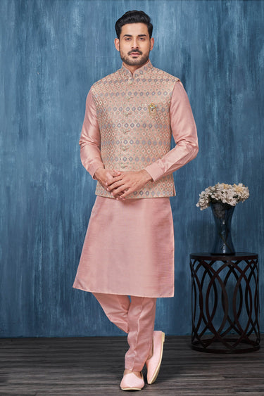 Pink Color Embroidery Work Banarasi Silk Fabric Function Wear Readymade Kurta Pyjama For Men With Jacket