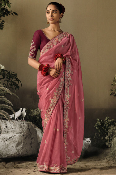Pink Color Festive Wear Art Silk Fabric Trendy Embroidered Border Work Saree With Designer Blouse