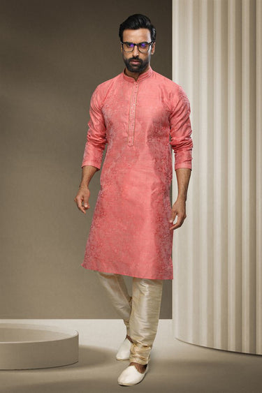 Pink Color Jacquard Silk Fabric Festive Wear Readymade Kurta Pyjama For Men