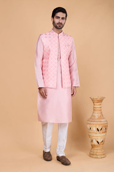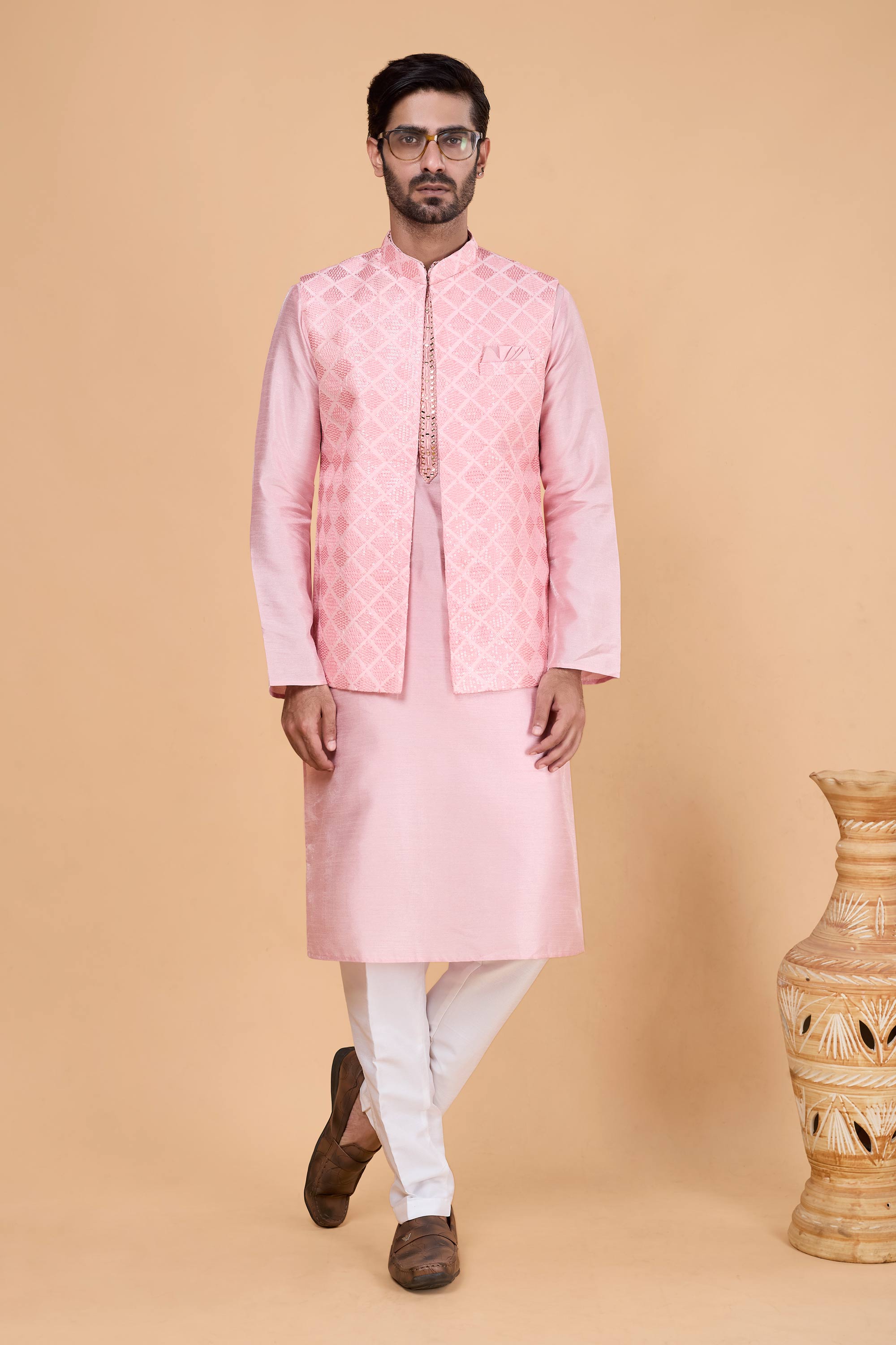 Pink Color Men Readymade Kurta And Aligadhi Pant With 3 Pcs Jacket Set For Wedding Wear