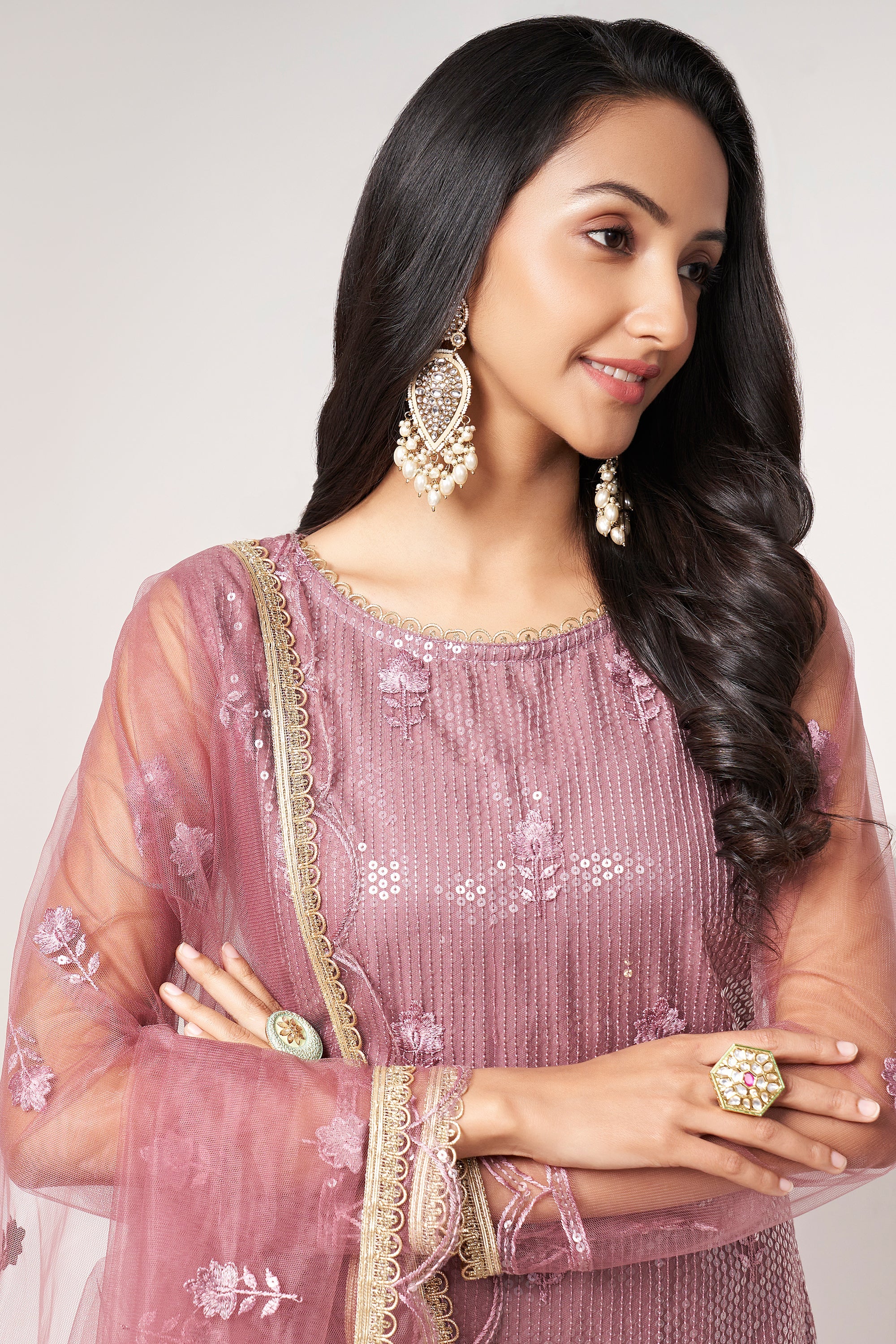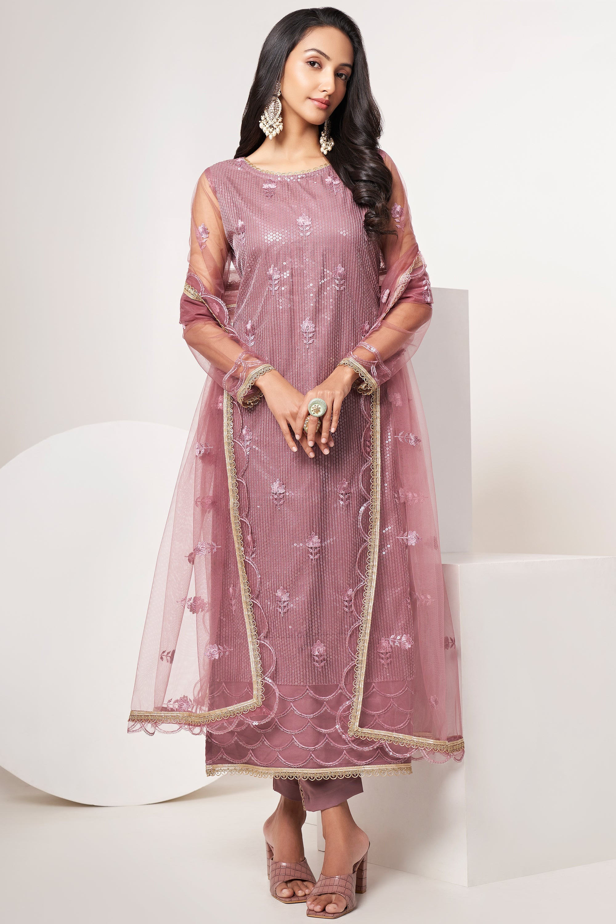 Pink Color Sequins Work Designer Straight Cut Suit In Net Fabric