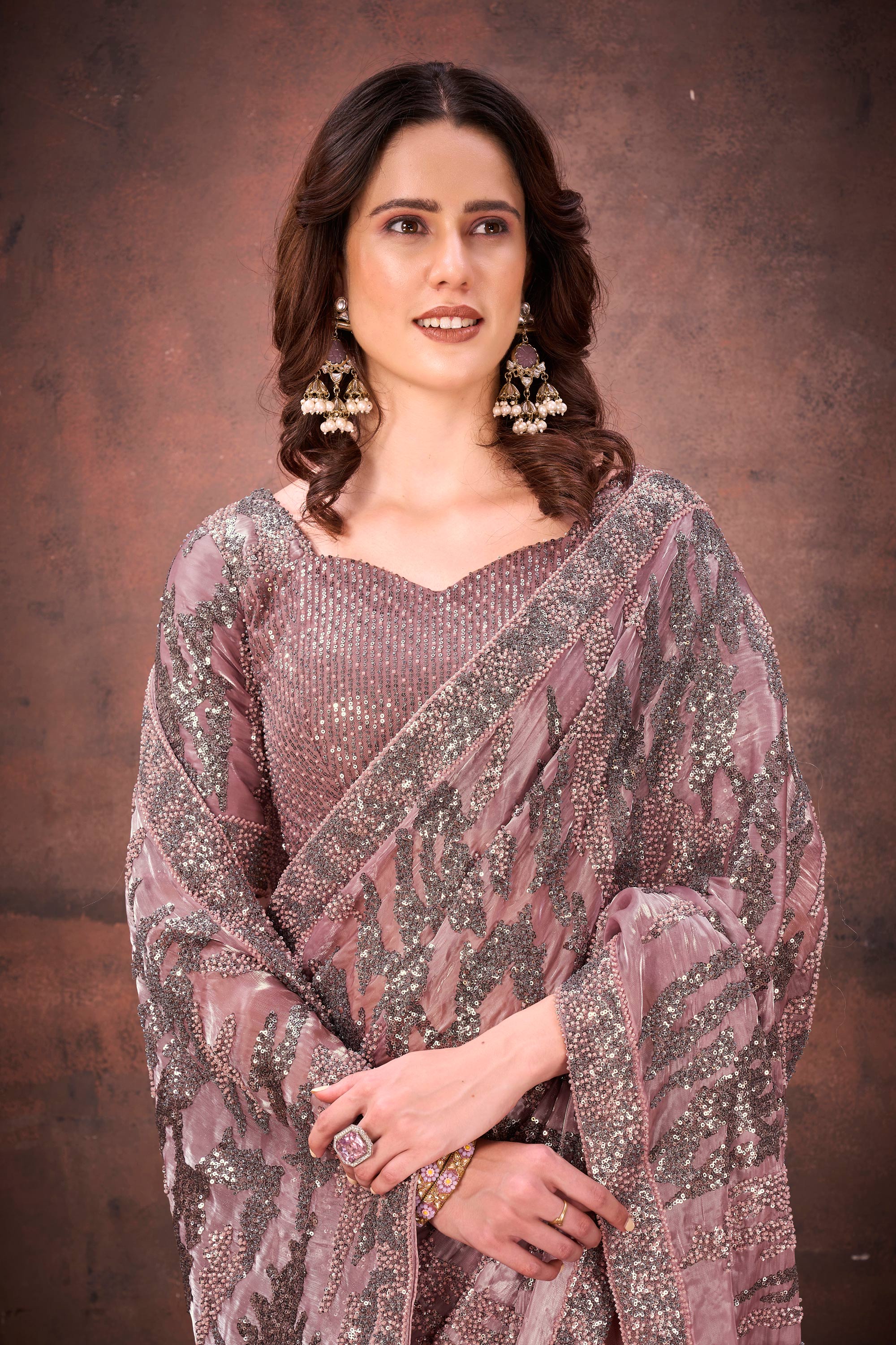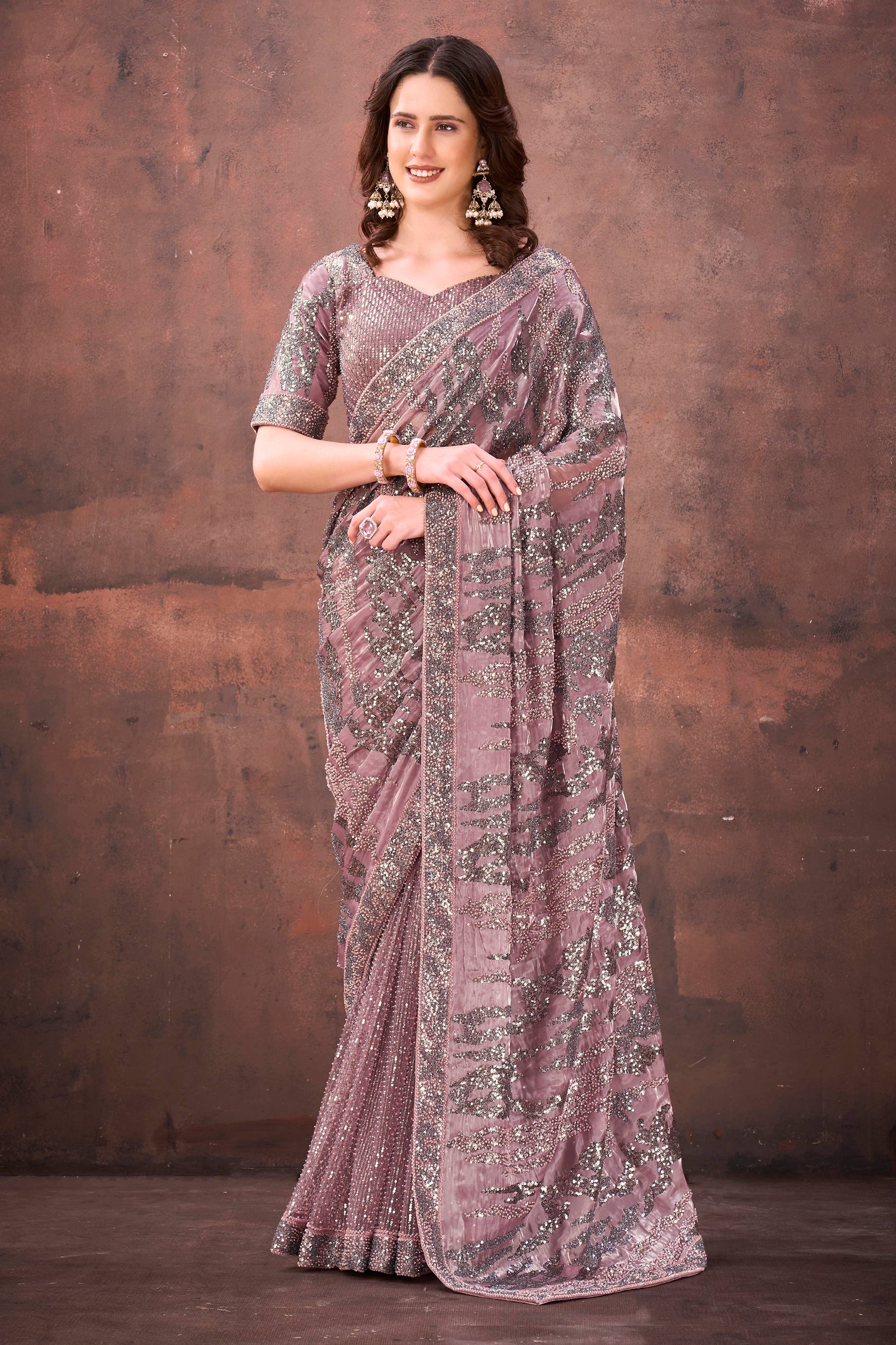 Pink Net Fabric Sequins Work Readymade Party Wear Saree