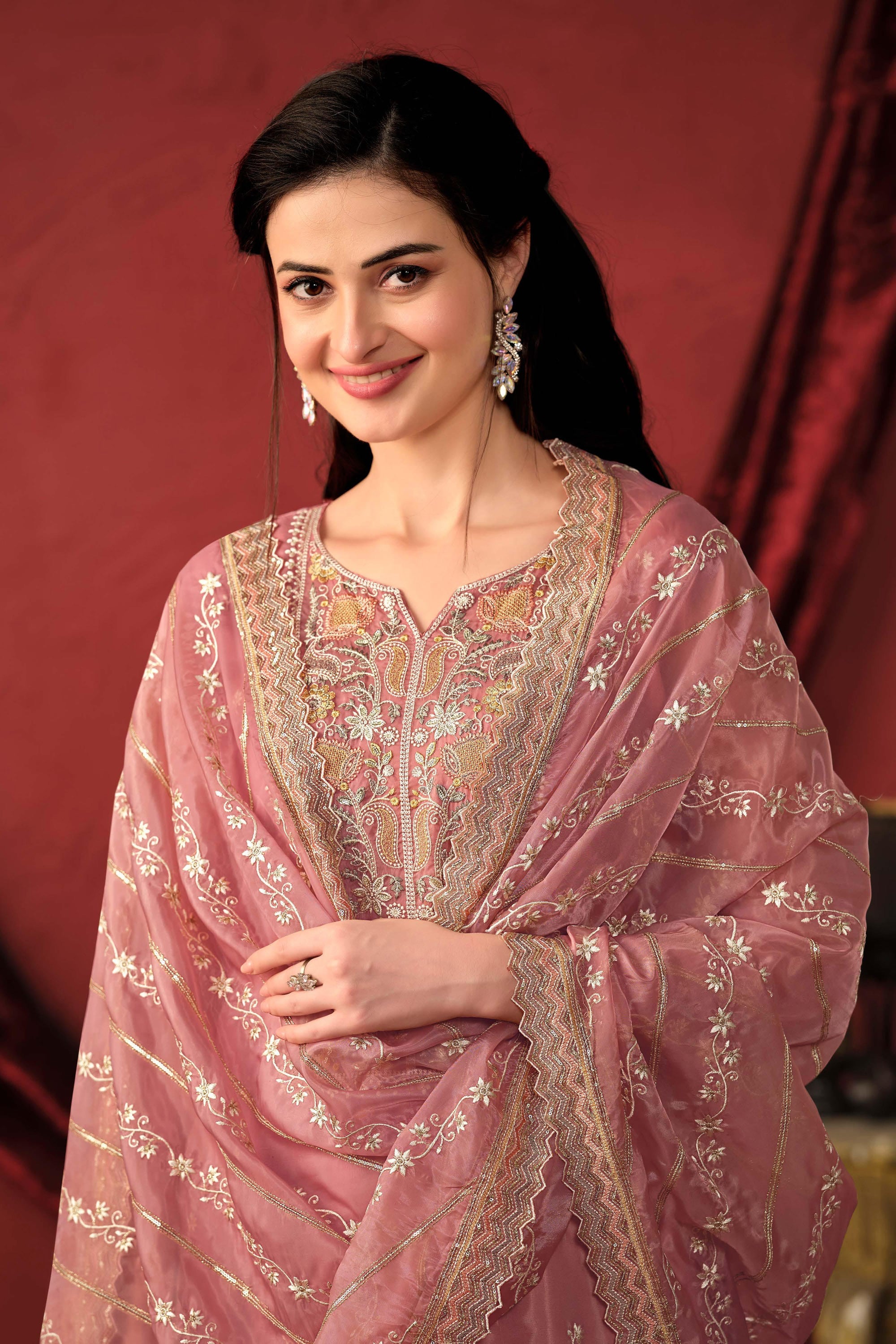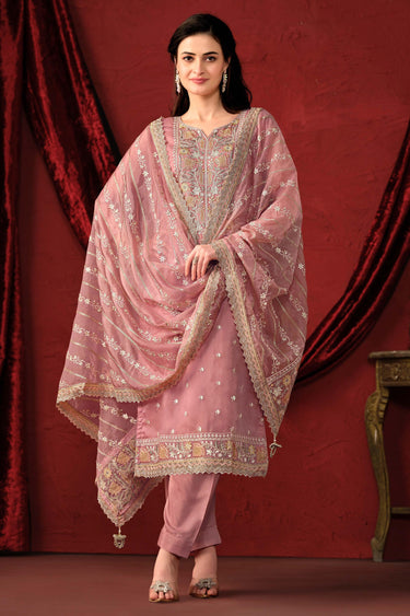Pink Organza Embroidered Straight Cut Suit For Function Wear