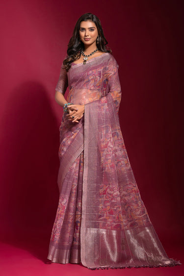 Pink Printed Pure Linen Zari Pattern Checks Daily Wear Saree With Blouse
