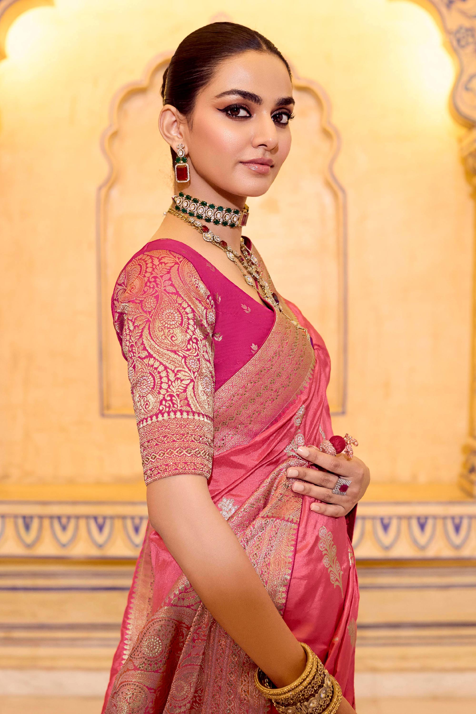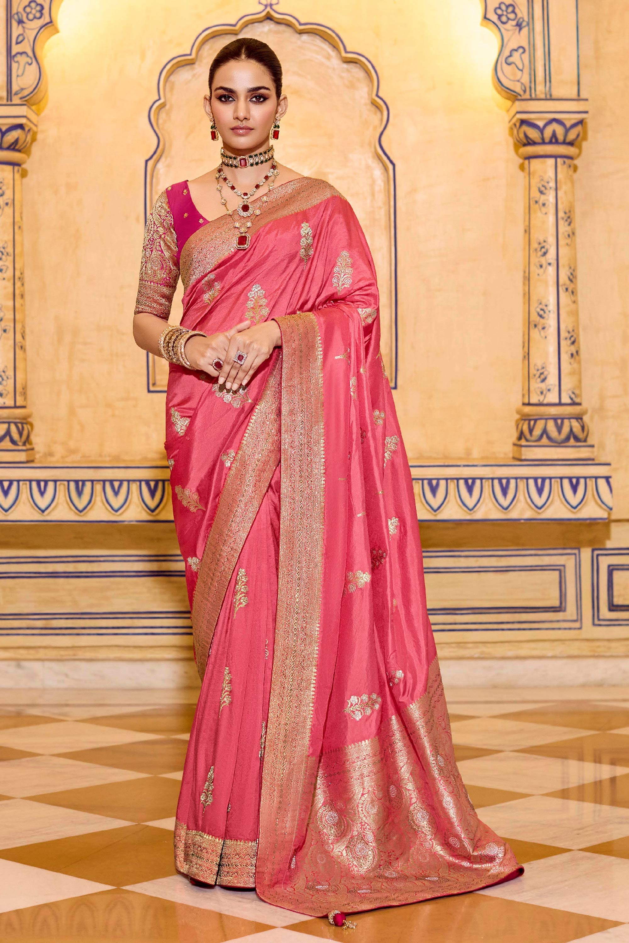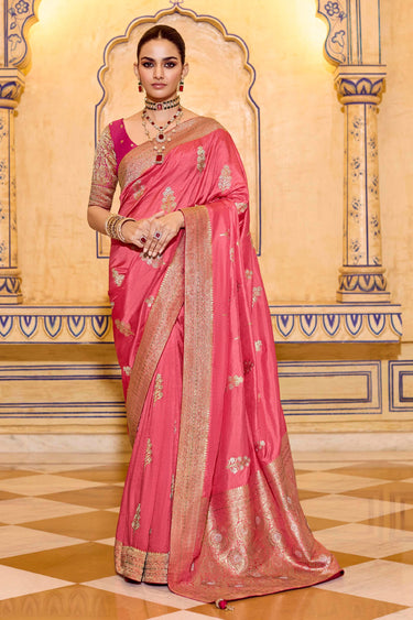Pink Wedding Wear Crepe Silk Weaving Work Saree