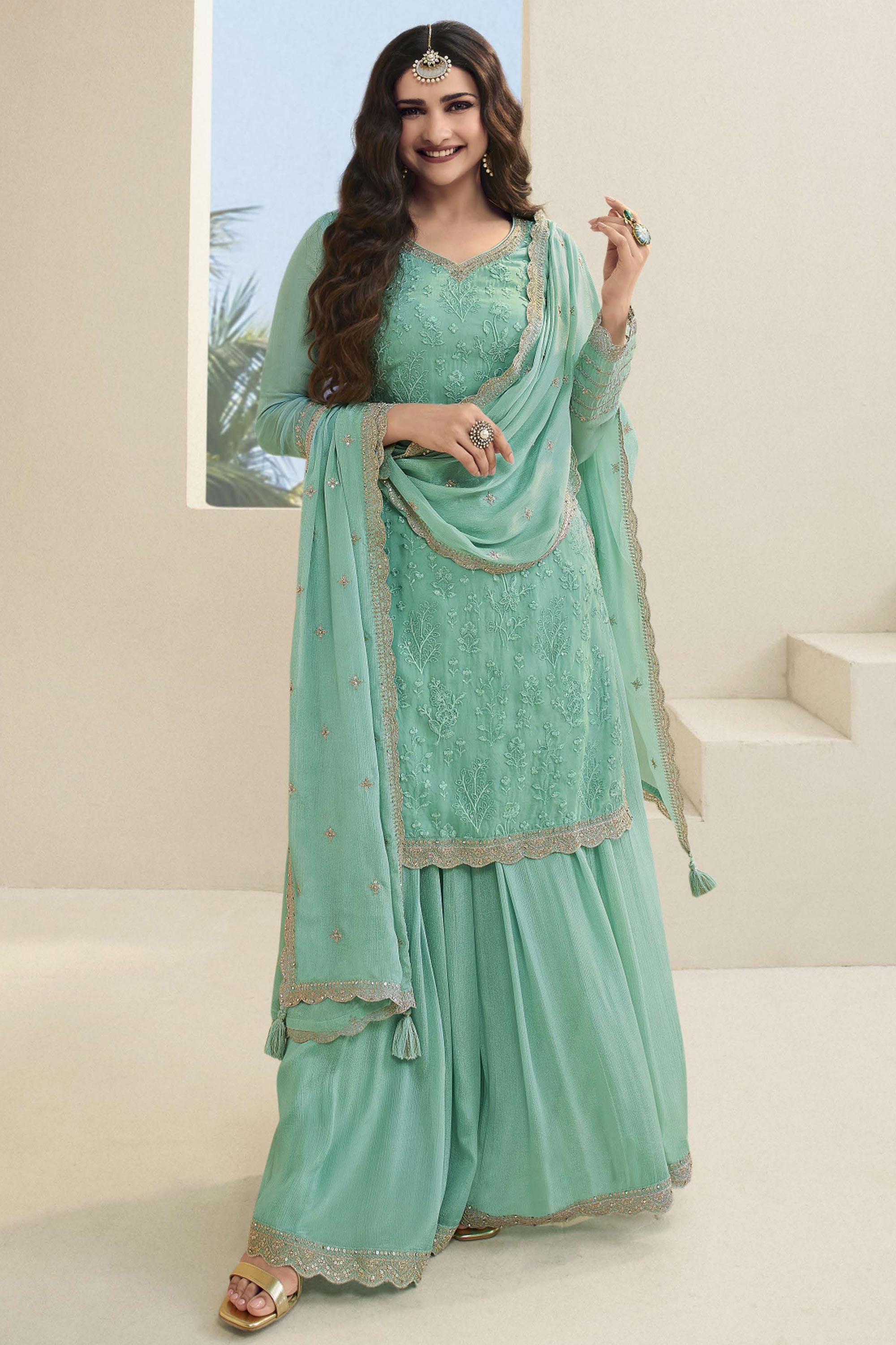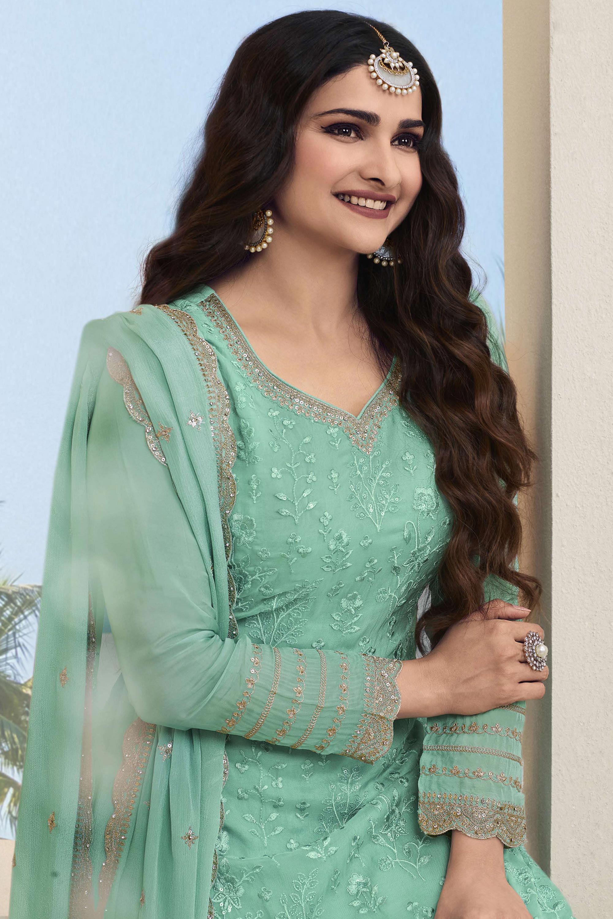 Prachi Desai Organza Fabric Sea Green Color Embroidered Palazzo Salwar Kameez