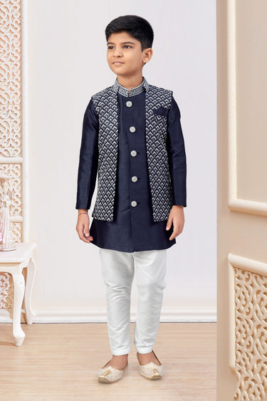Bring elegance to your boy's wardrobe with the Reach Color Traditional Wear Boys Readymade Indo Western. Perfect for festive occasions, this outfit blends contemporary style with traditional elements. Crafted with attention to detail, the set includes a stylish kurta and matching bottoms. The vibrant colors and intricate embroidery make it a standout piece. Designed for comfort and ease, it features soft fabric that allows for free movement. This outfit ensures your little one looks dapper and feels comfortable, whether at a family gathering or cultural event. Sizes are available for boys of all ages. Order now to add a touch of tradition to your boy's wardrobe.