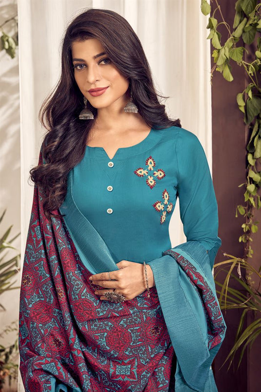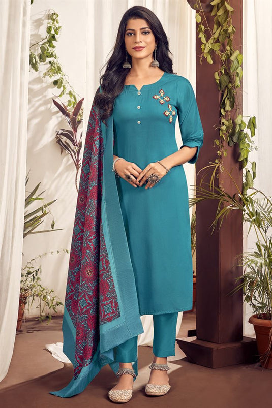 Pretty Cotton Teal Color Readymade Straight Cut Salwar Suit With Printed Dupatta