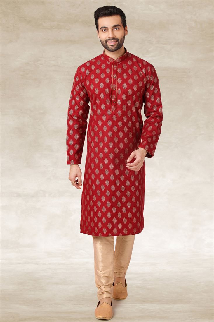 Printed Work Maroon Color Cotton Fabric Luxurious Kurta Pyjama In Function Wear