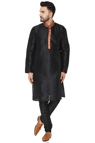 Puja Wear Dhupion Silk Fabric Black Color Redaymade Kurta Pyjama For Men