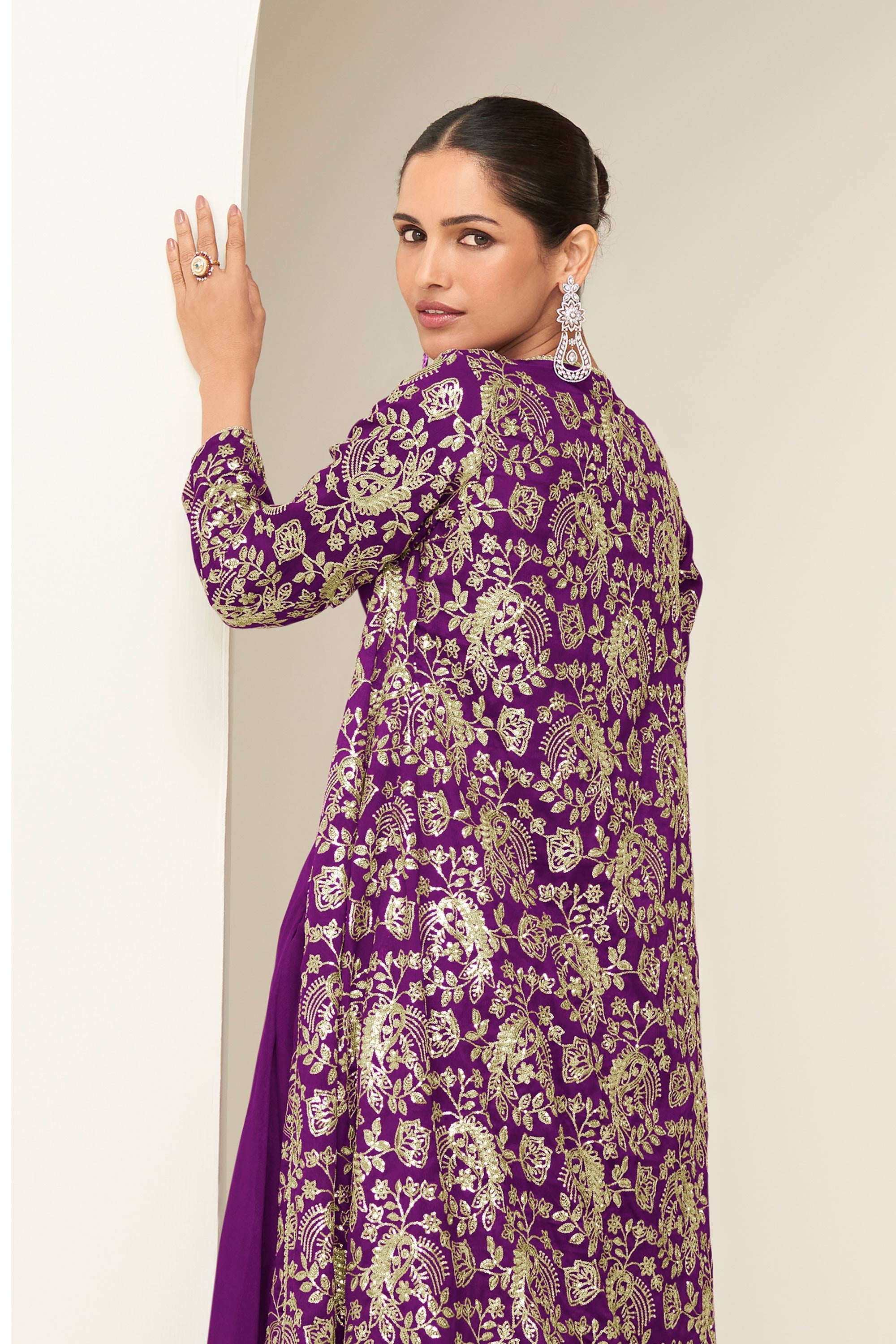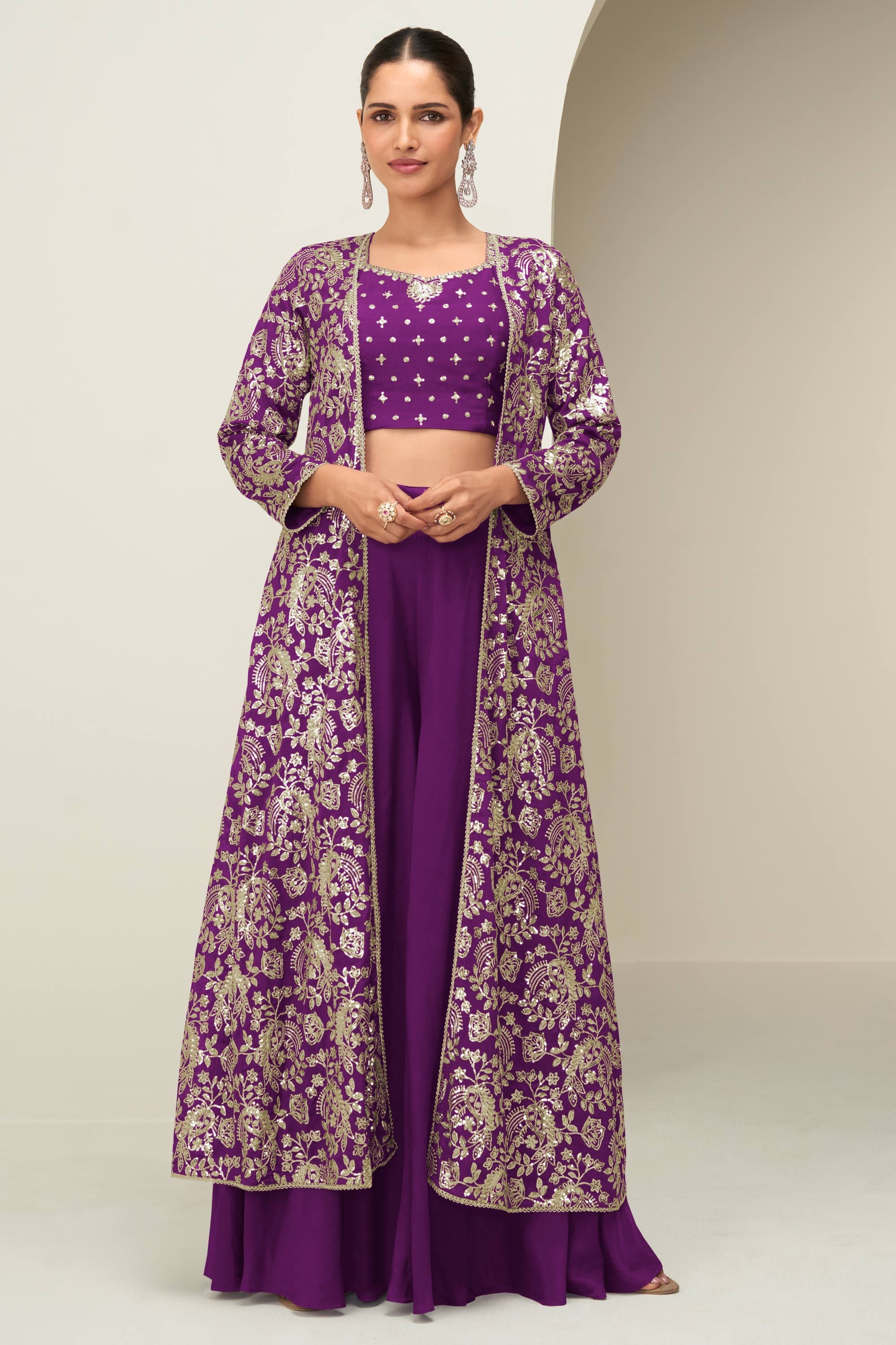 Purple Chinon Silk Embroidered Indo Western Palazzo Suit