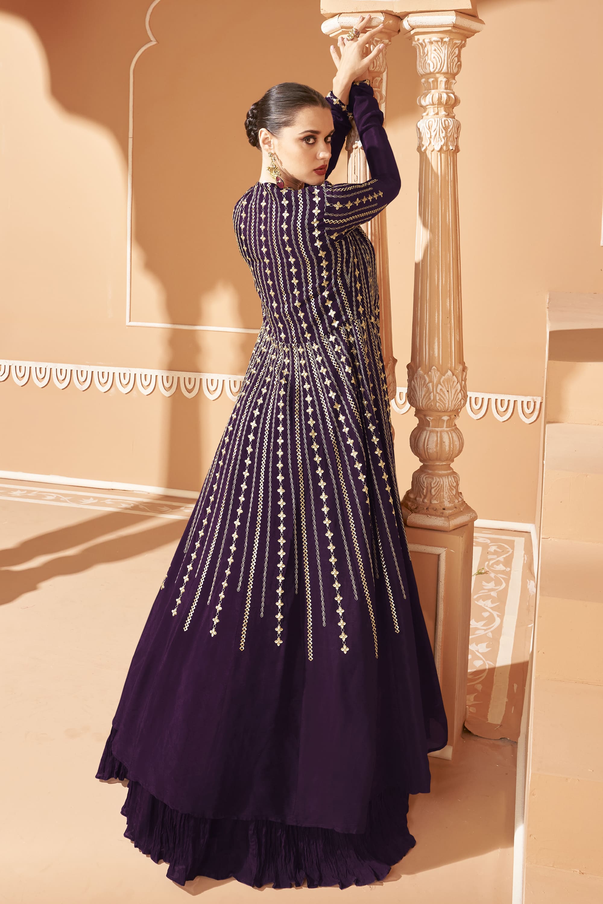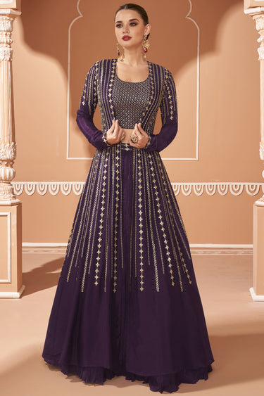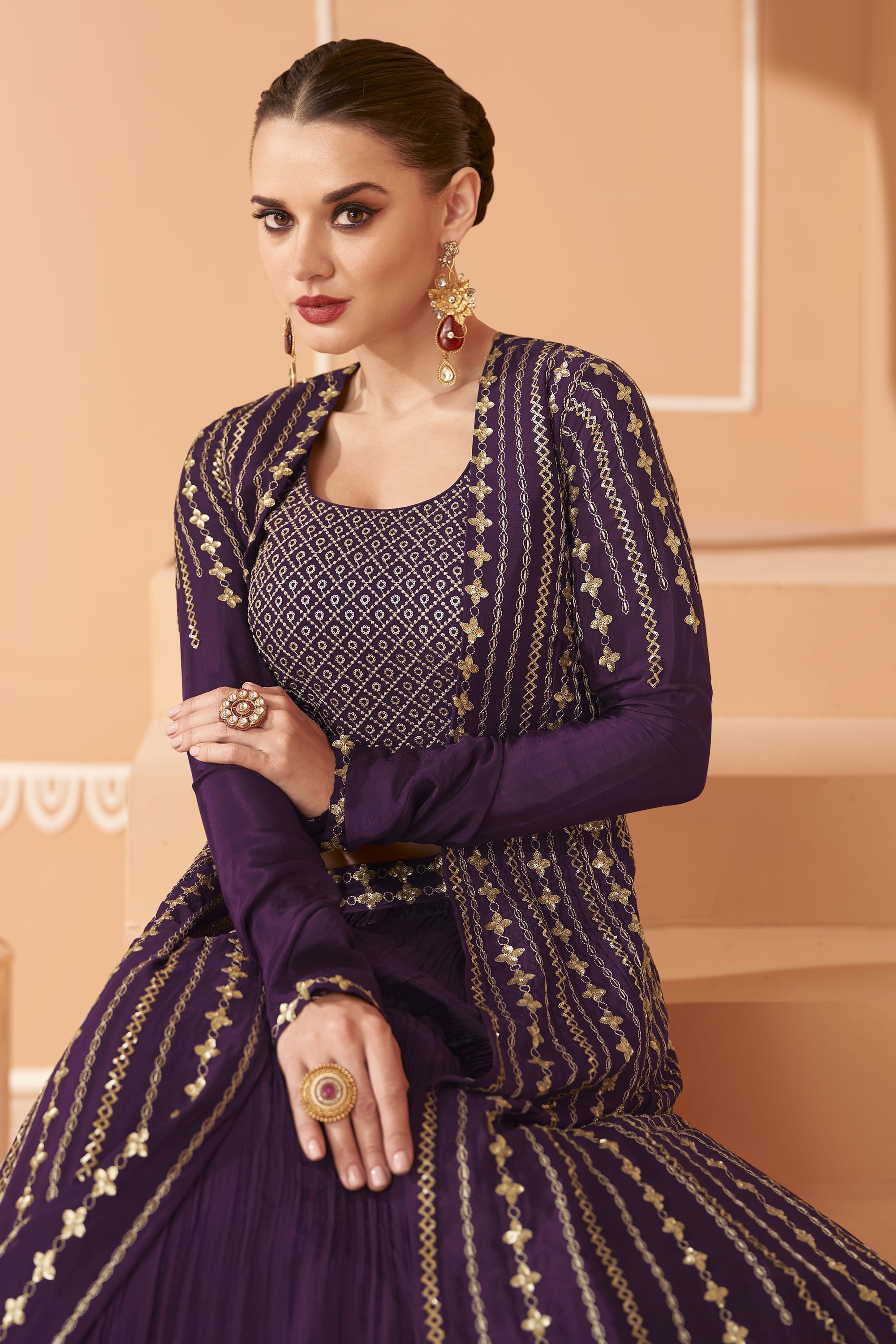 Purple Color Embroidered Work Chinon Silk Fabric Beatific Readymade Indo Western Lehenga With Shrug