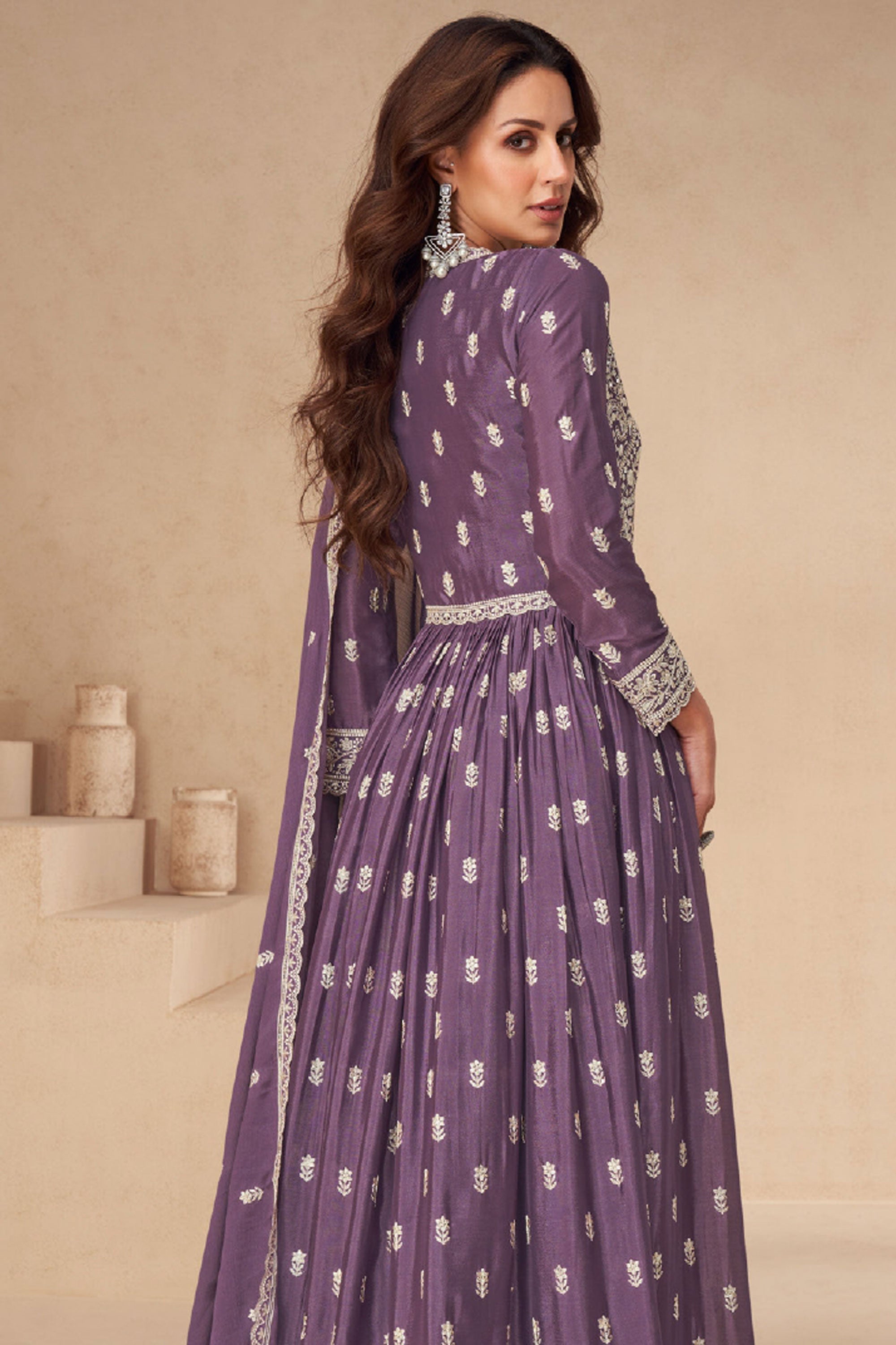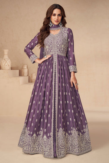 Purple Embroidered Chinon Silk Readymade Anarkali Suit