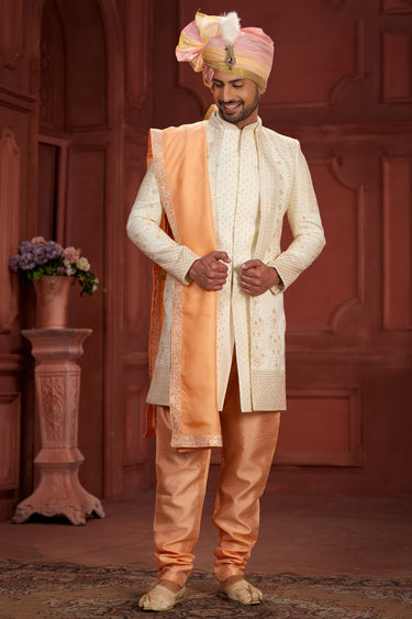 Radiant Embroidered Beige Color Silk Fabric Readymade Sherwani