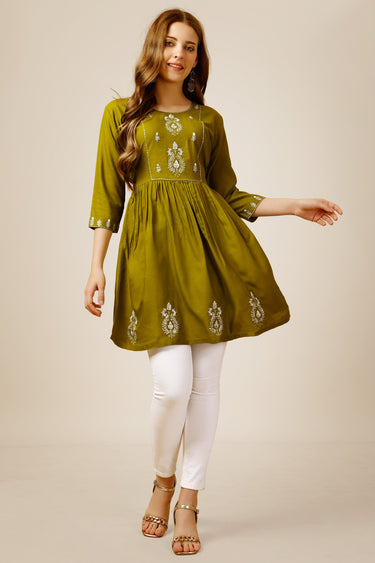 Radiant Mehendi Green Color Rayon Fabric Readymade Short Kurti