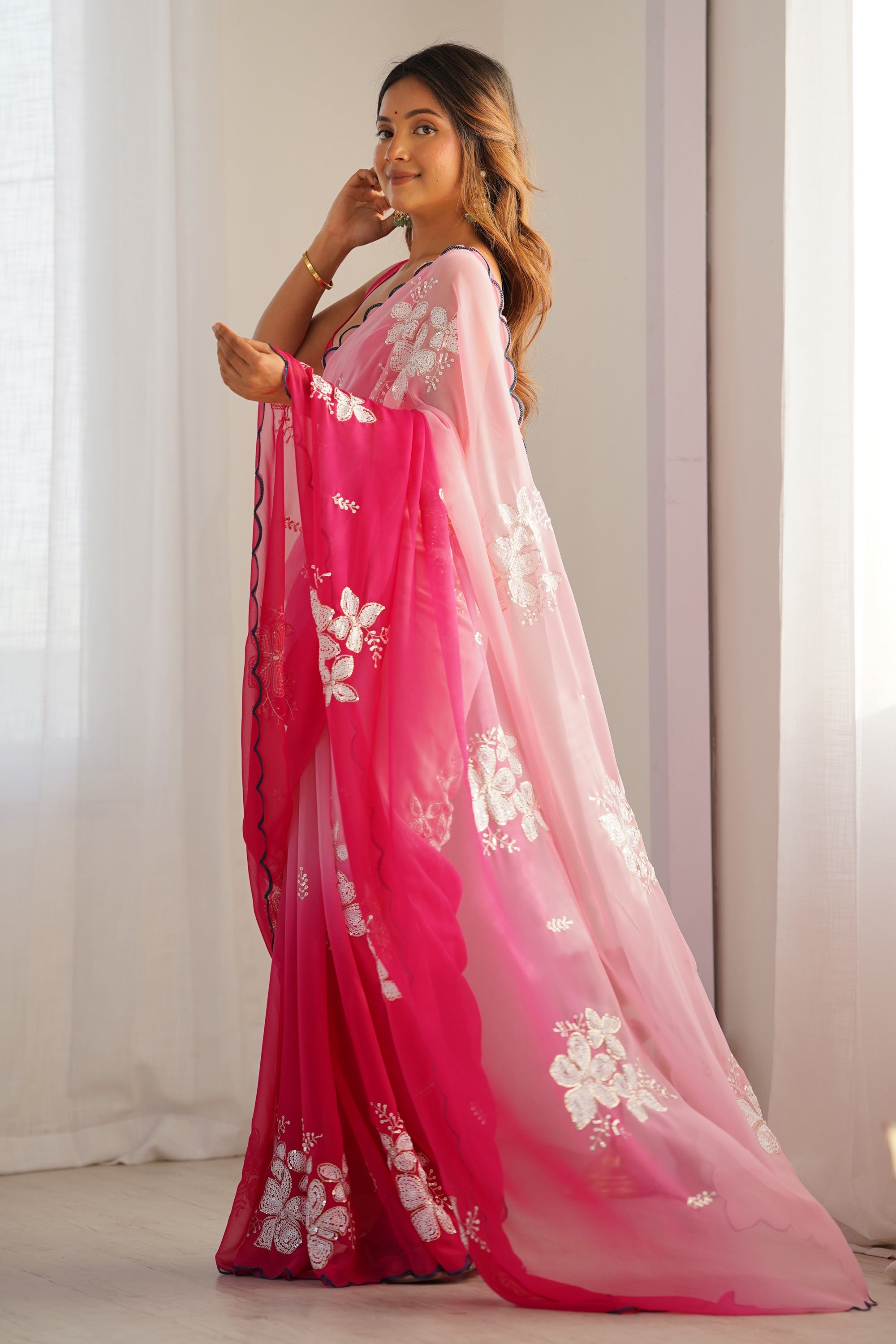 Introducing the Reach Color Sequins Work Georgette Casual Saree with Blouse! This elegant saree is made from lightweight georgette fabric, perfect for any casual event. The delicate sequins work adds just the right touch of sparkle, making you feel beautiful and confident. The accompanying blouse piece can be tailored to fit your personal style, providing a complete look. Ideal for social gatherings, this saree ensures comfort and fashion. Embrace the timeless appeal and enjoy an effortlessly chic appearance. Whether it's a family gathering or a casual get-together, this saree will have you looking stunning.