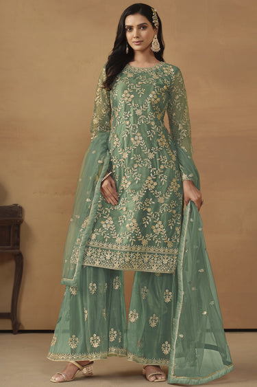 Radiant Sea Green Color Net Fabric Embroidered Palazzo Suit
