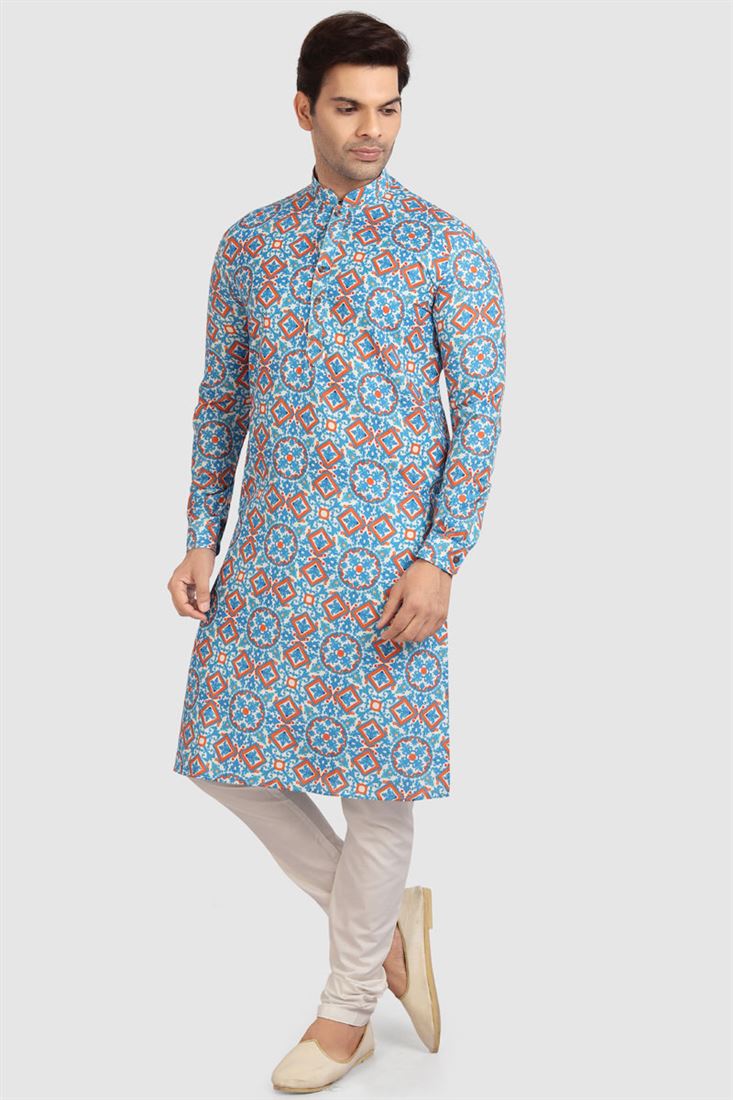 Radiant Sky Blue Color Festival Wear Cotton Fabric Kurta Pyjama