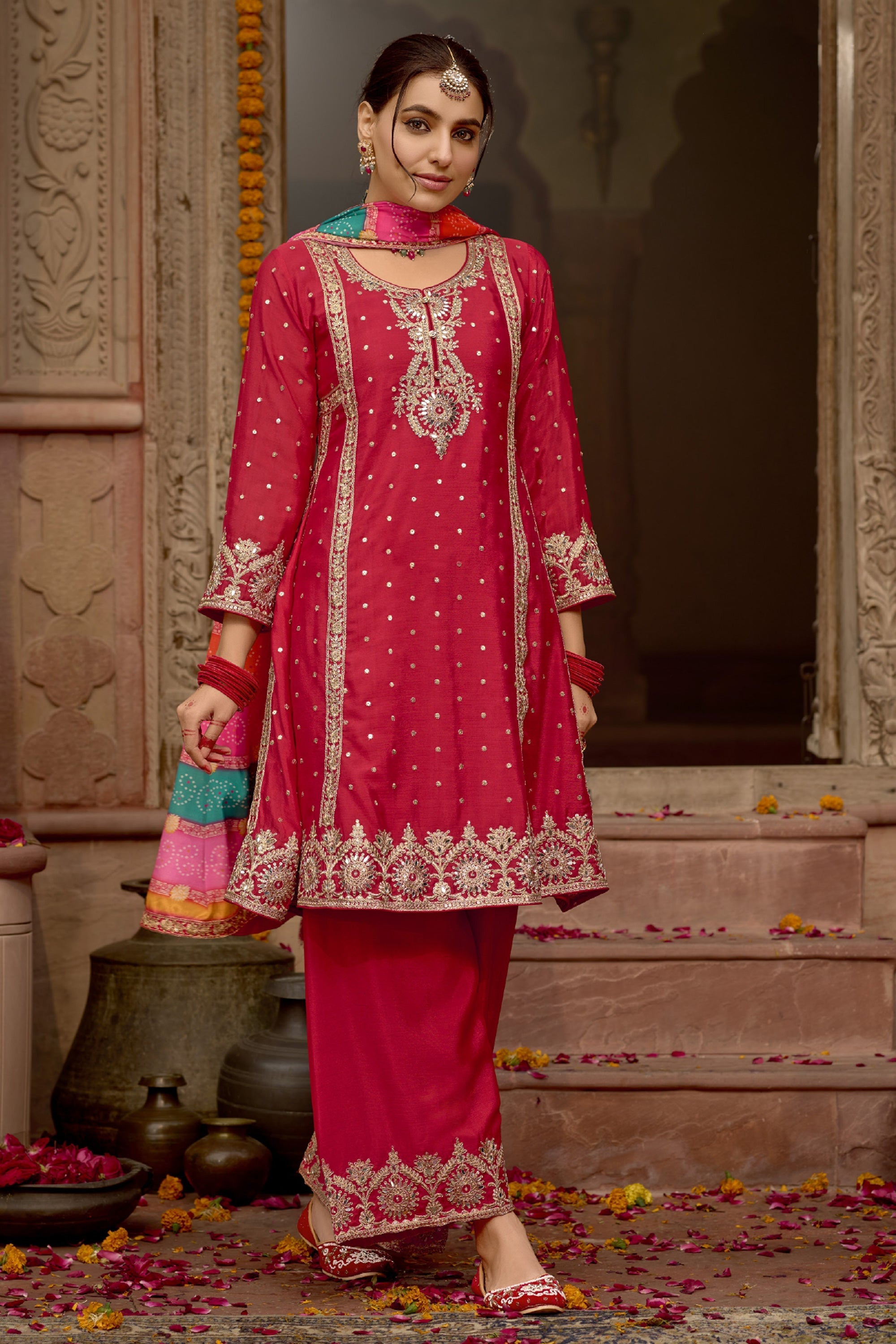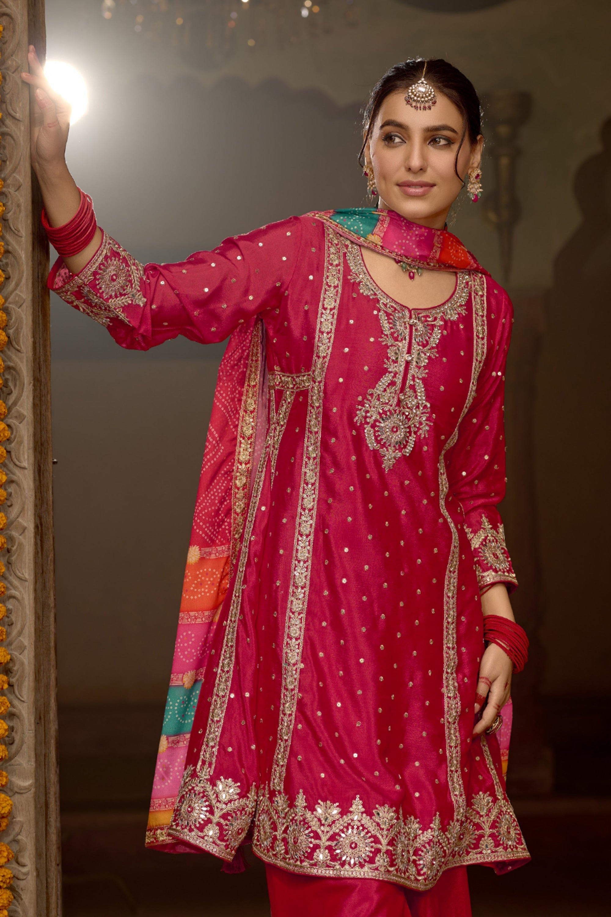 Introducing our stunning Embroidered Chinon 3 Piece Designer Salwar Suit in a vibrant reach color. Perfect for any special occasion, this suit combines traditional charm with modern style. The intricate embroidery work on high-quality Chinon fabric ensures you look graceful and elegant. The set includes a beautifully embroidered kameez, comfortable salwar, and a matching dupatta, making it a complete ensemble. Available in various sizes to fit you perfectly. Turn heads and receive endless compliments when you wear this exquisite piece. Make a lasting impression with our designer salwar suit, where style meets comfort.