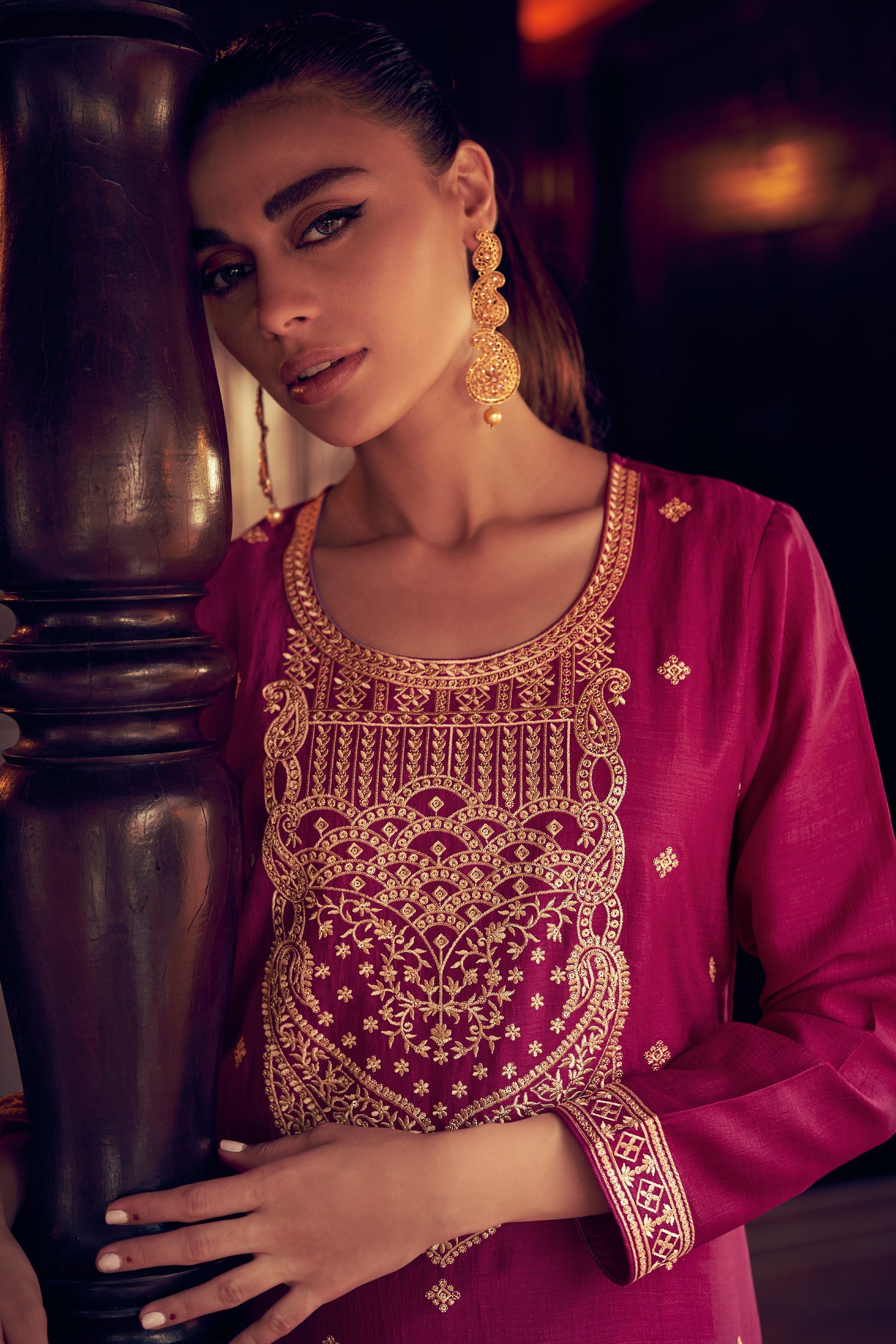 Dazzle everyone at your next function in our Long Palazzo Salwar Kameez. Created with sumptuous art silk fabric and finished with elegant embroidery, this straight cut design promises to give you an uber-stylish look. The high-waist, long palazzo trousers ensure comfort while the straight cut salwar kameez flaunts your poise. Add this ensemble to your collection and let the celebration begin in style!