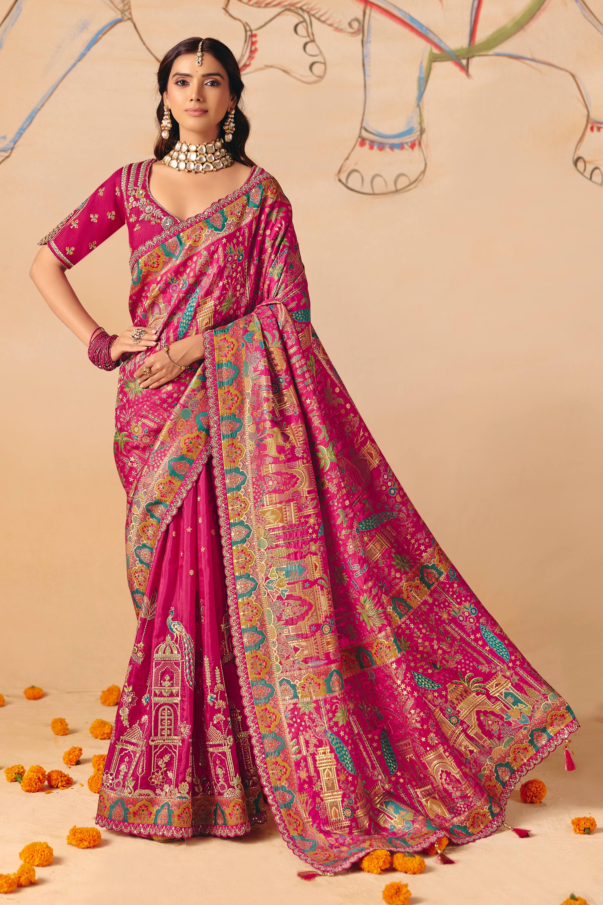Step into festive elegance with this Traditional Silk Saree crafted from smooth silk and paired with a silk blouse. The beautiful weaving work enhances its traditional look, while the rich color makes it perfect for sangeet and special occasions. Slight color variation may occur due to digital photography.