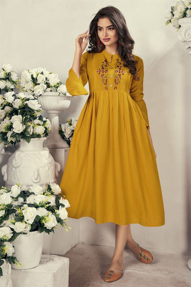 Rayon Fabric Festive Wear Fancy Mustard Color Thread Embroidered Kurti