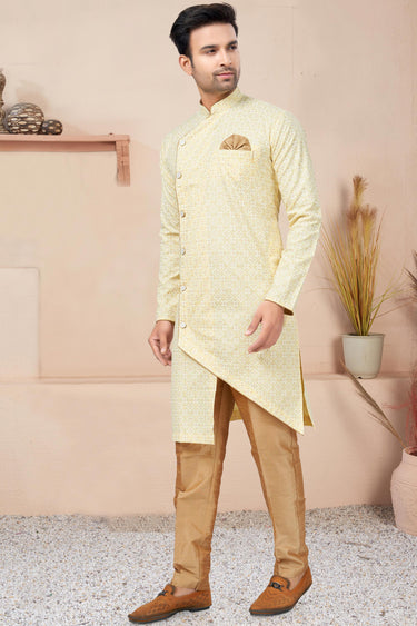 Enjoy the beautiful Ethnic Luxury Men's Printed Readymade Indo-Western Attire, designed from pure, breathable cotton fabric. Showcasing vibrant prints that will lend an attractive and cultural touch to your overall look. This Indo-Western wear ensures a perfect fit and unrivaled comfort, offering a fusion of traditional and modern aesthetics.