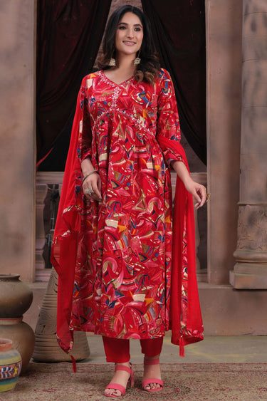 Red Color Festive Wear Printed Anarkali Salwar Suit In Rayon Fabric