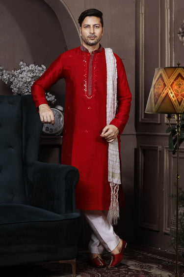 Red Color Silk Fabric Wedding Wear Designer Readymade Kurta Pyjama For Men