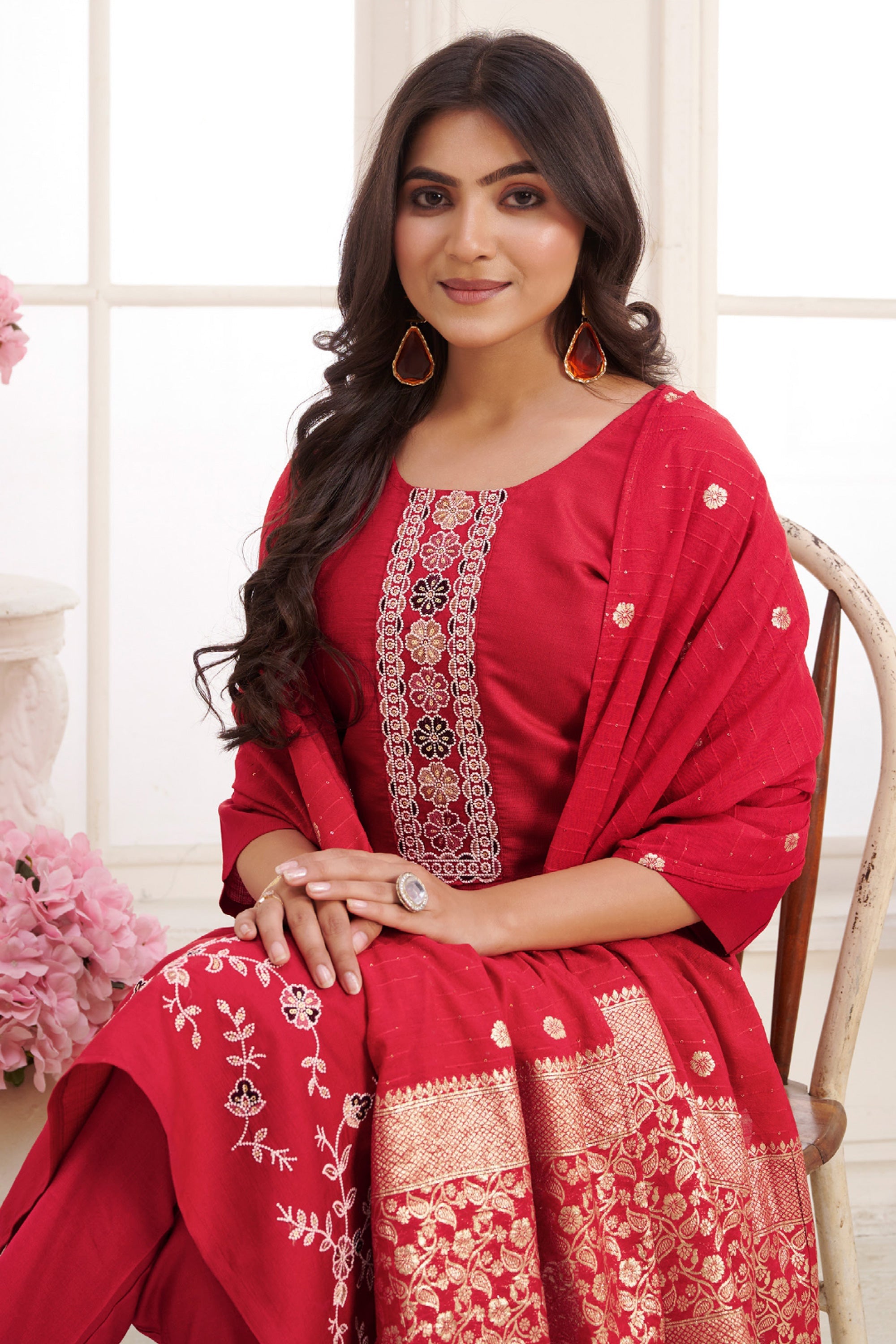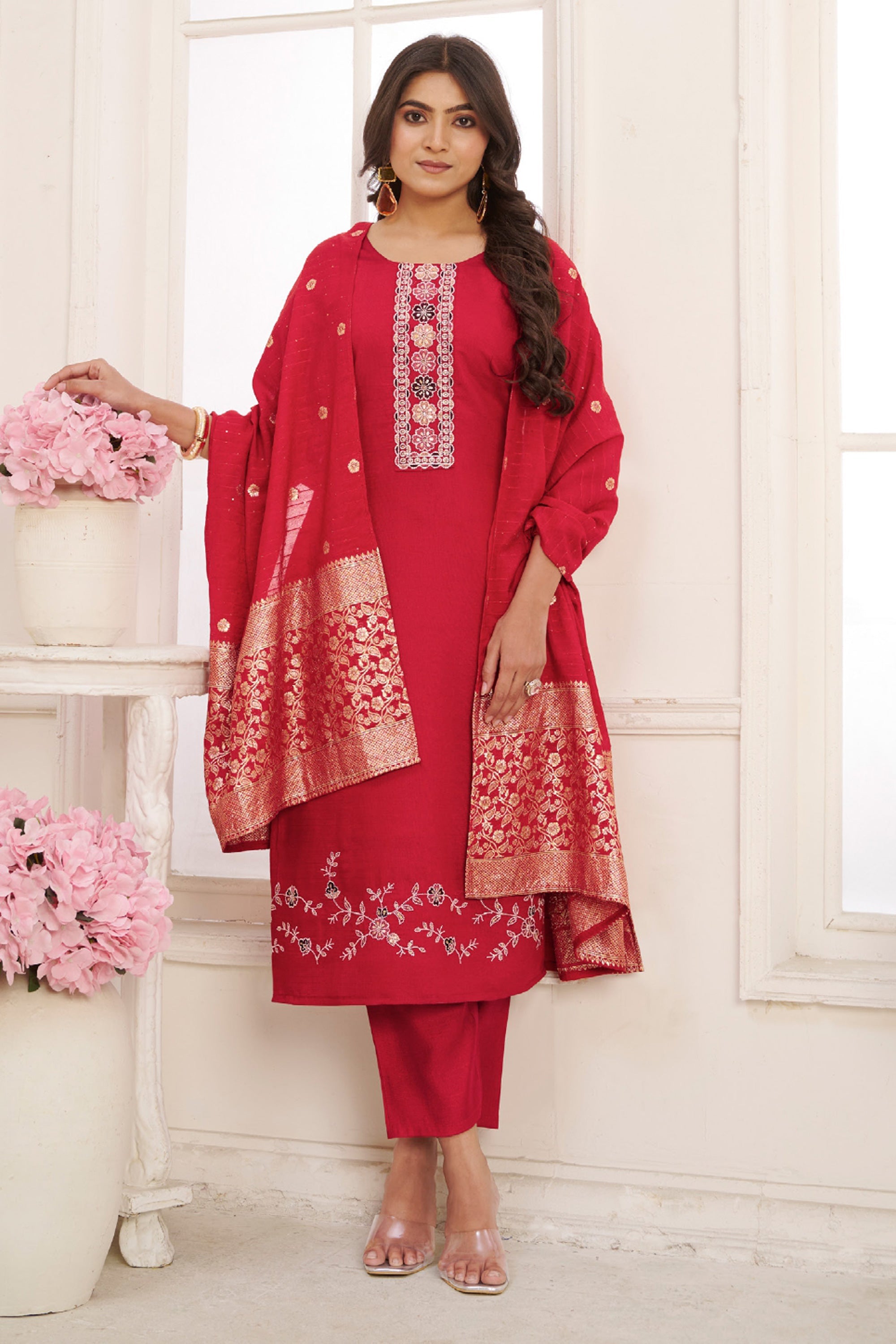 Experience the luxury of our Viscose Silk Reach Color Straight Cut Salwar Suit With Dupatta. Made from high-quality viscose silk, this outfit offers unmatched comfort and style. The straight cut design ensures a flattering fit, making it perfect for various occasions. The rich colors add a vibrant touch to your wardrobe, while the matching dupatta enhances its elegance. Pair it with your favorite accessories to complete the look. Ideal for festive events, weddings, or casual gatherings, this salwar suit is a versatile addition to any wardrobe.