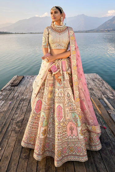 Regal Beige Silk Bridal Lehenga Choli With Embroidered Double Dupatta