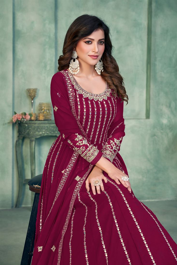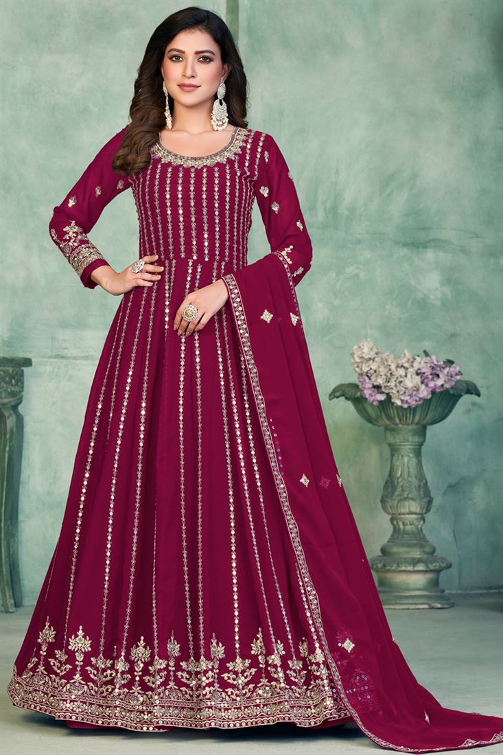 Sangeet Wear Embroidered Anarkali Salwar Kameez In Georgette Fabric Rani Color
