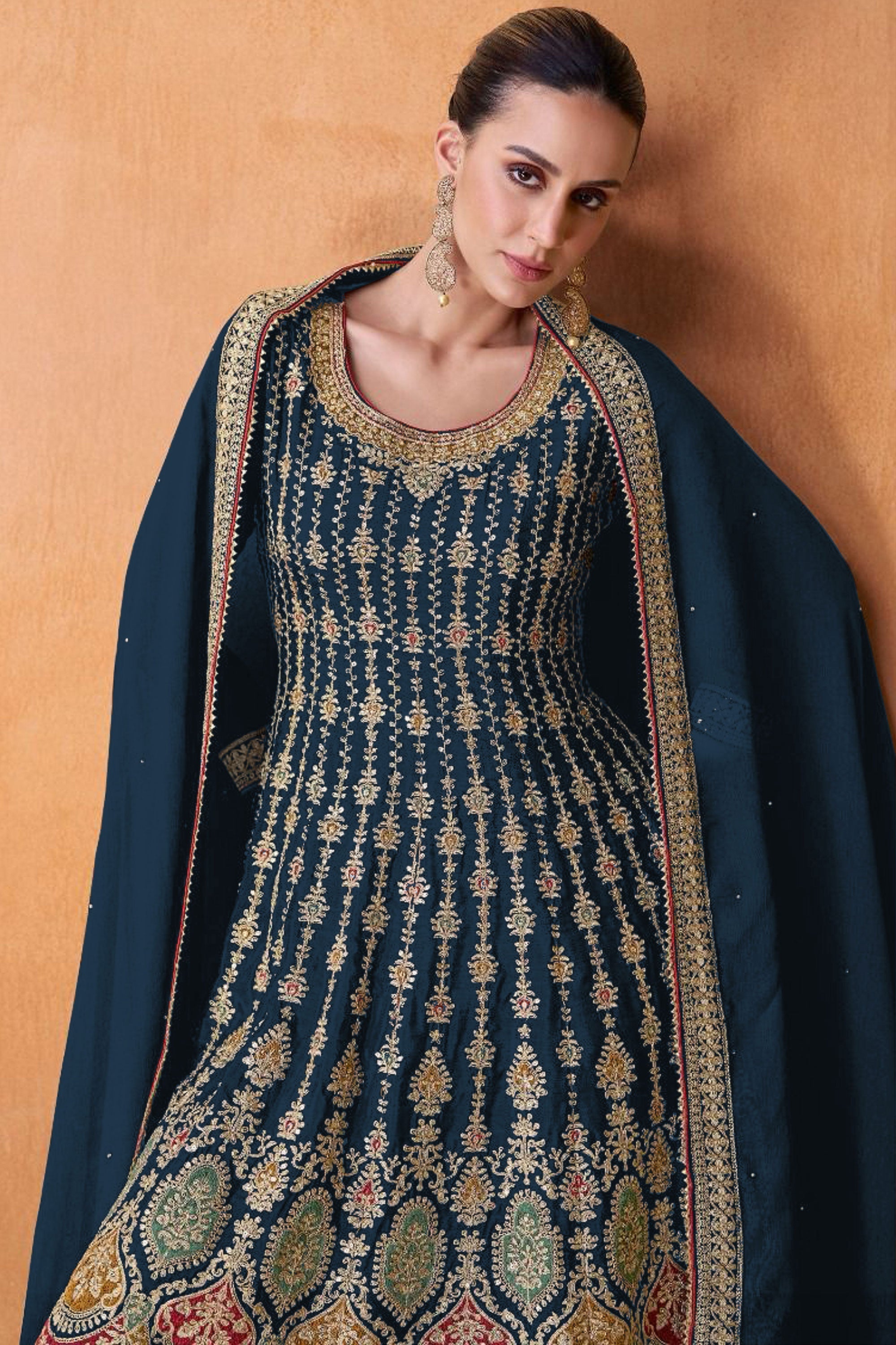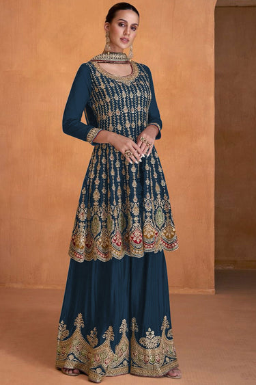 Sangeet Wear Embroidered Palazzo Salwar Kameez In Georgette Fabric Teal Color