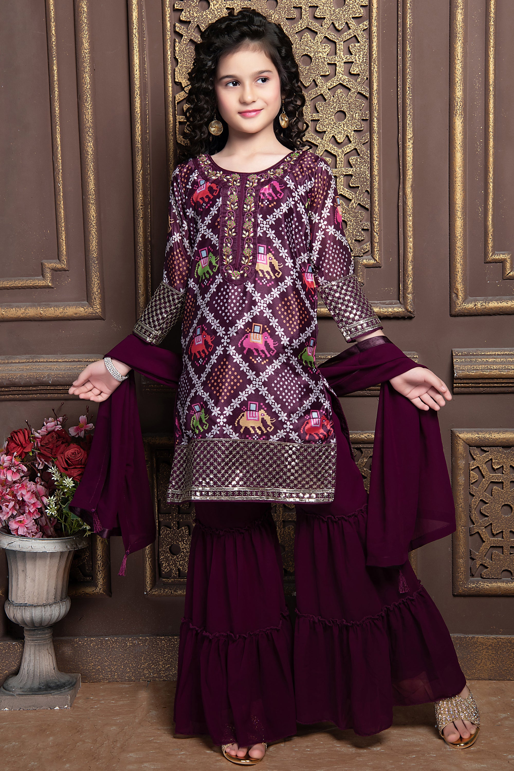 Sangeet Wear Georgette Fabric Purple Color Captivating Readymade Kids Palazzo Salwar Kmaeez