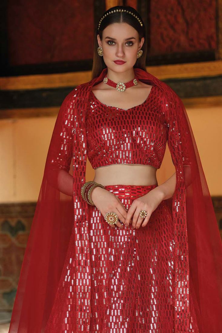 Sangeet Wear Net Fabric Designer Red Color Sequins Work Riveting Lehenga