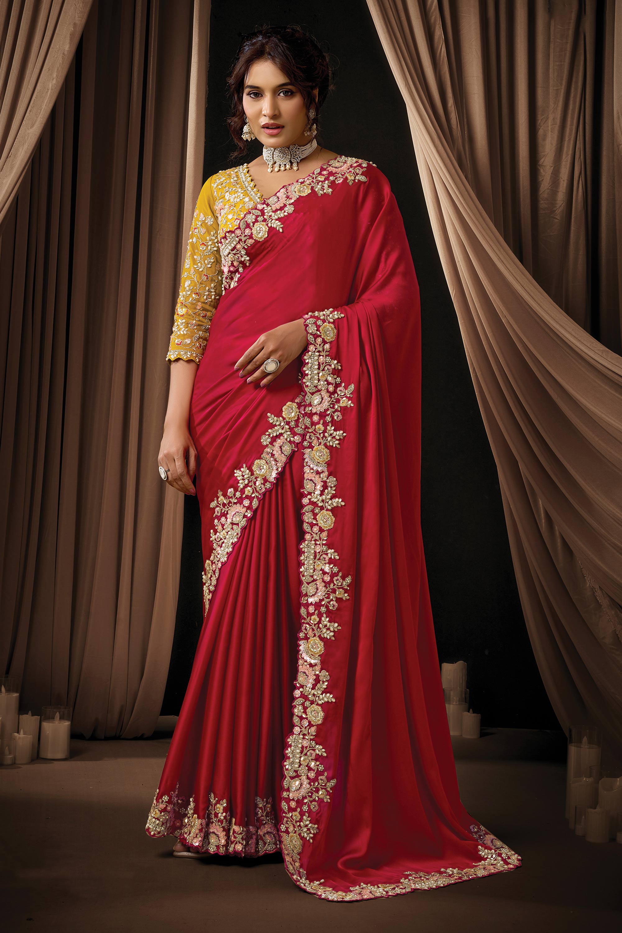 Satin Silk Embroidered Red Saree For Function Wear