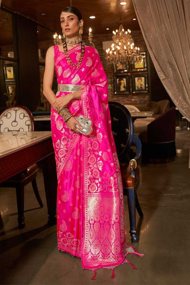 Satin Silk Fabric Rani Color Weaving Work Soothing Saree