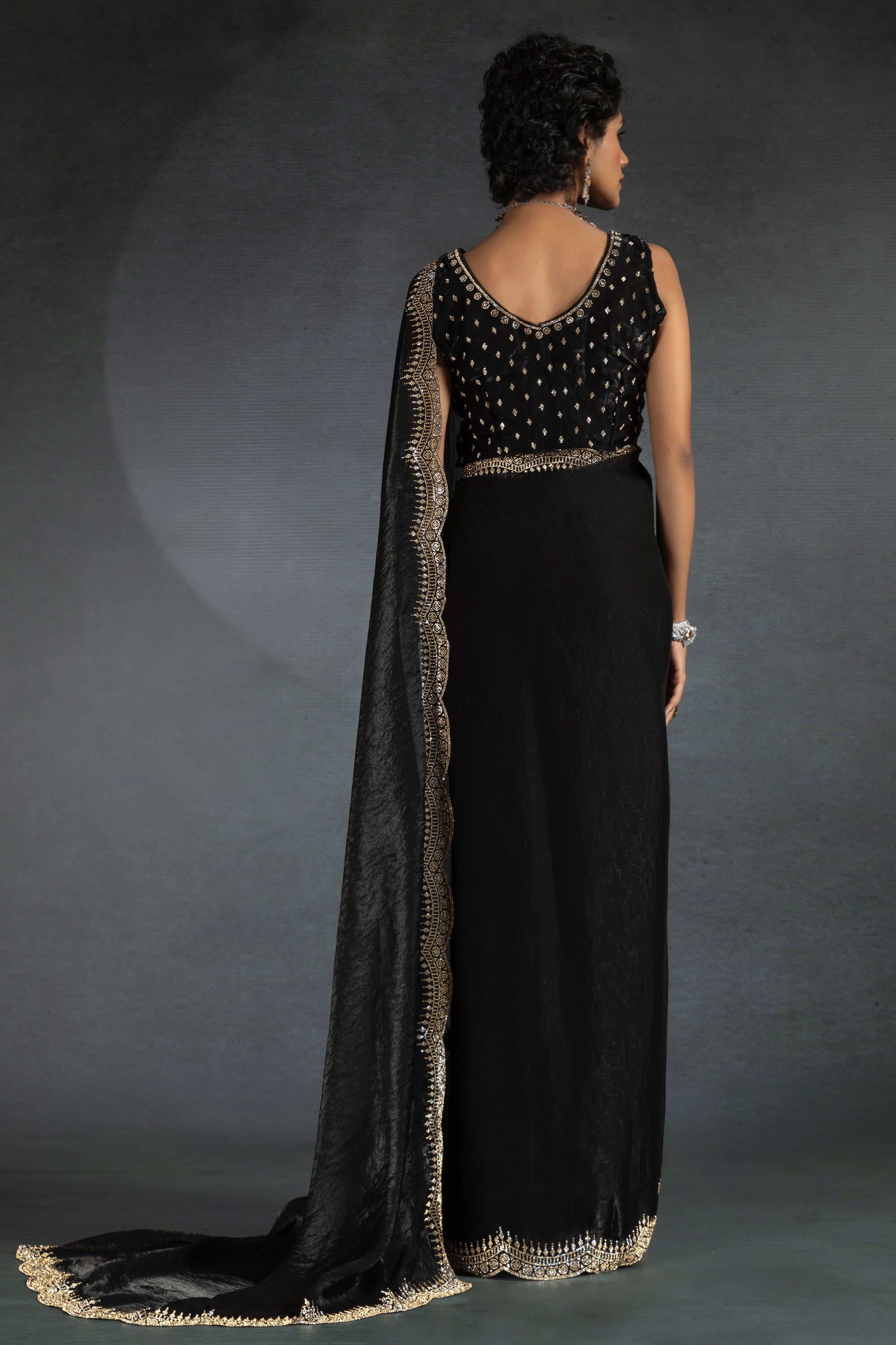 Satin Silk Stone Border Work Saree In Black Color