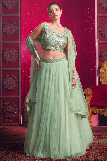 Sea Green Color Alluring Sangeet Function Lehenga Choli In Net Fabric