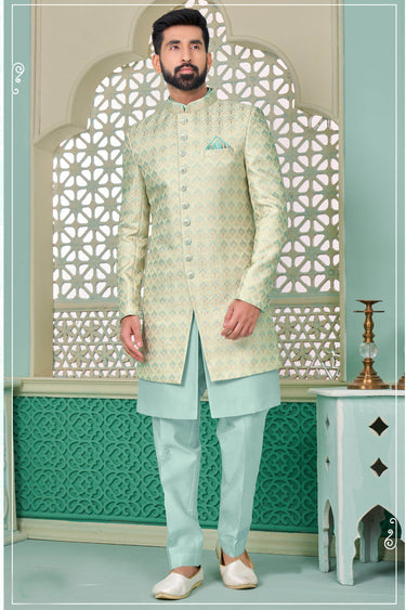 Sea Green Color Banarasi Silk Fabric Captivating Readymade Nawabi Style Indo Western