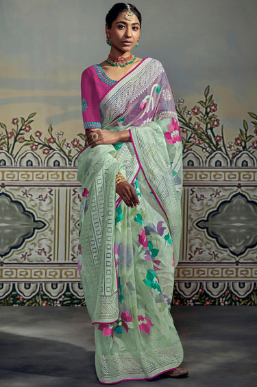 Sea Green Color Brasso Work Organza Fabric Superior Saree