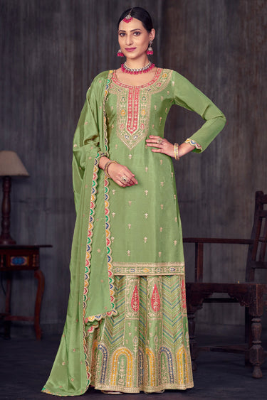 Sea Green Color Chinon Fabric Embroidered Function Wear Sharara Top Lehenga