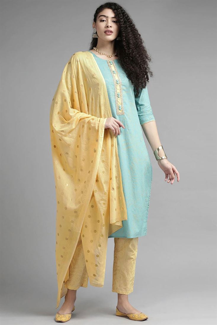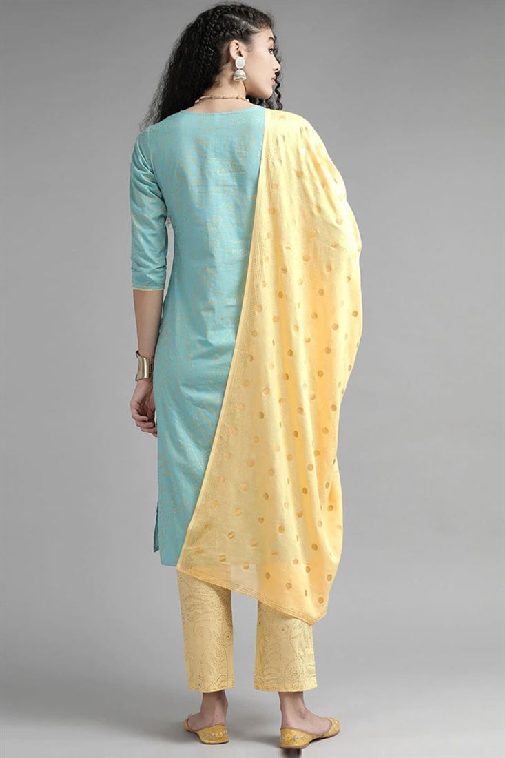 Sea Green Color Cotton Kurti Bottom Set With Dupatta