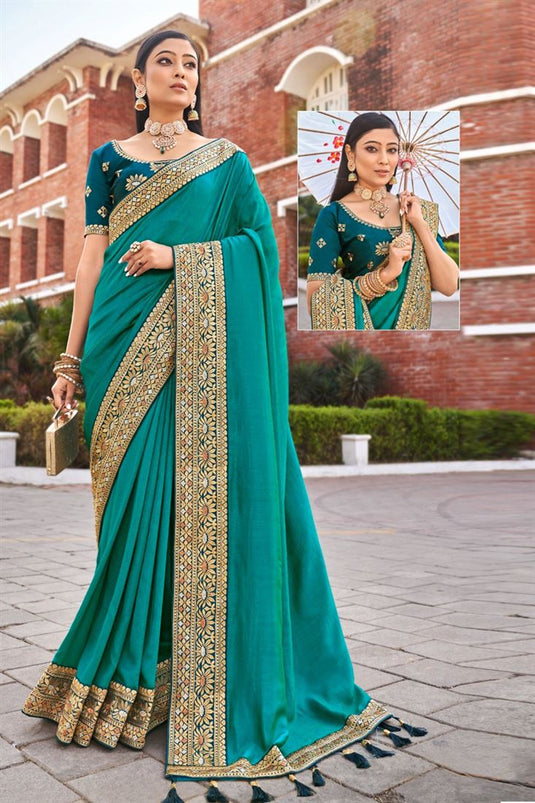 Sea Green Color Delicate Lace Border Work Saree In Vichitra Silk